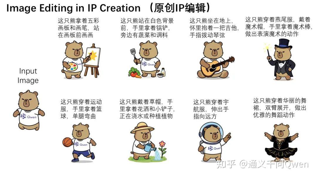 可以看到,虽然编辑后的图像大多数像素与输入图像(最左侧的图)都不一样,但依然完美地保持了卡皮巴拉的角色一致性。Qwen-Image的强大的语义编辑能力使其能够轻松地进行原创IP的多样化创作。
