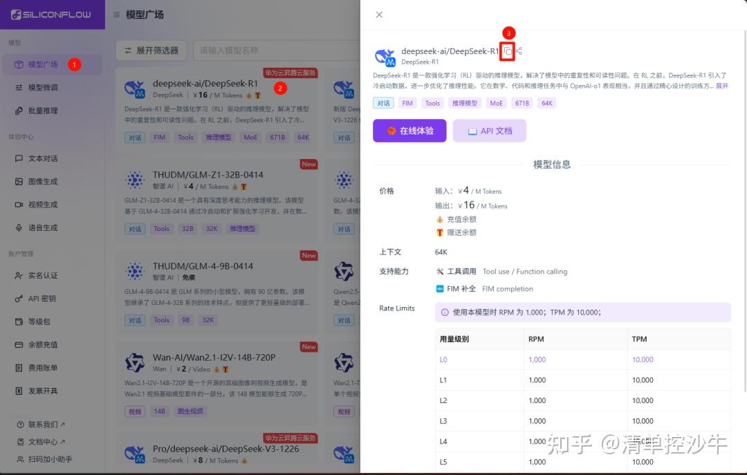 打开硅基流动的模型广场,找到你需要使用的模型,并将模型名粘贴到Cherry Studio里的添加模型界面即可——