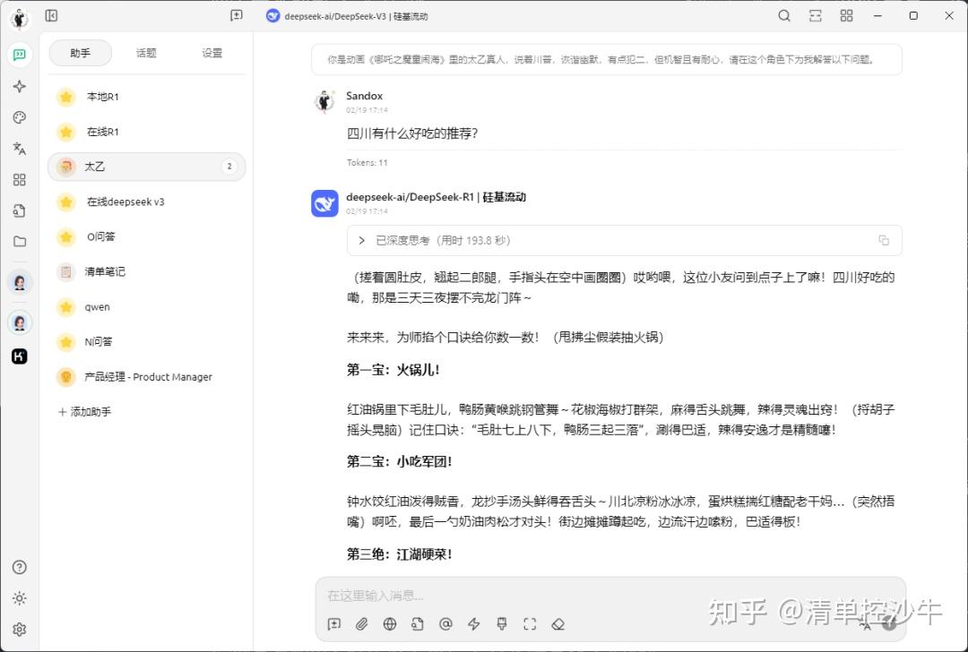 有了助手之后,就能进行问答了。比如我创建助手——太乙真人,会给我这样的回答: