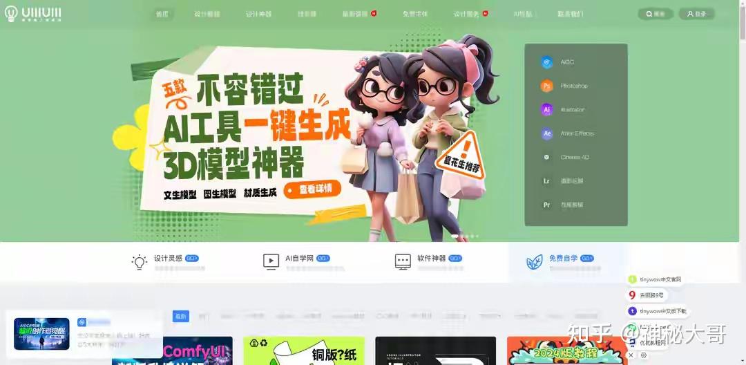 8. 优优网(uiiiuiii.com):免费设计软件自学平台,AIGC、Midjourney、C4D等教程都是原创,适合想玩新技术的朋友。