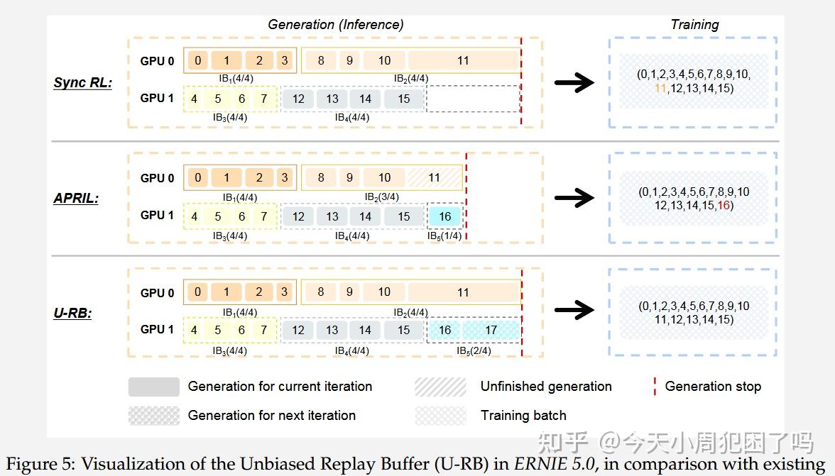 相关的所有采样从推理池移至训练池,由训练引擎更新参数。通过这种动态划分,U-RB 既防止了因个别长样本导致的计算空闲,又保持了无偏的数据分布。