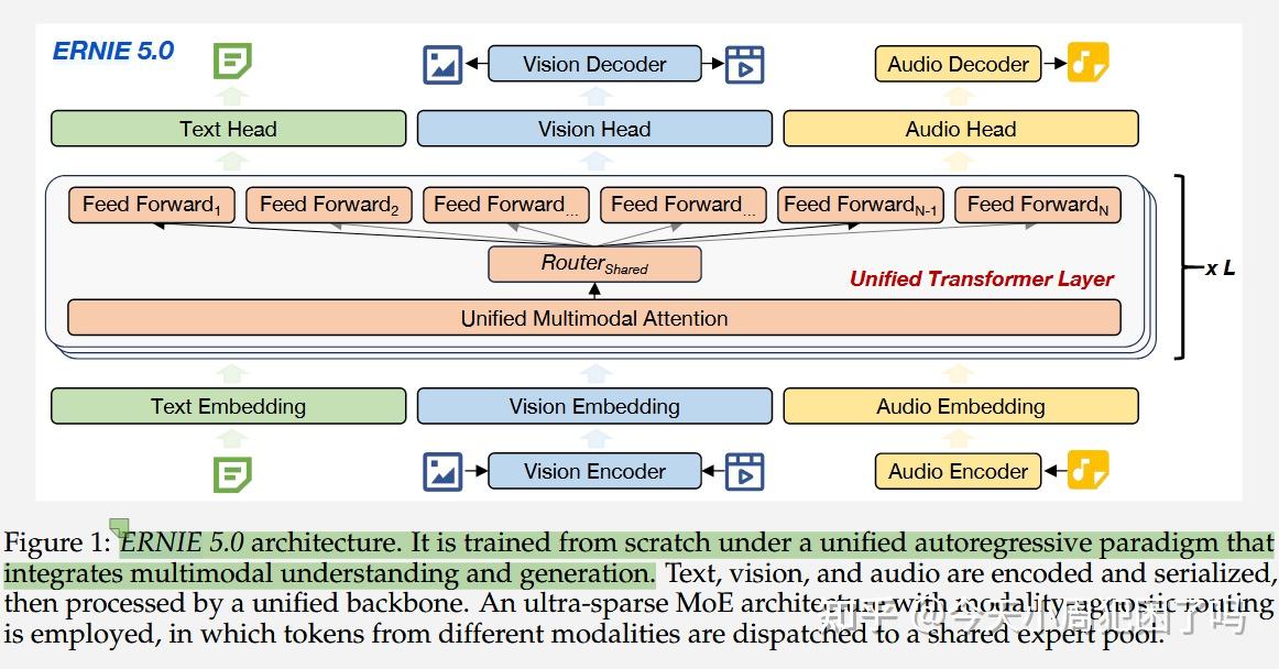 ERNIE 5.0采用超稀疏混合专家架构,将语言、图像、视频和音频集成在单一自回归框架内,以实现多模态理解和生成。其架构如图1⬇️所示