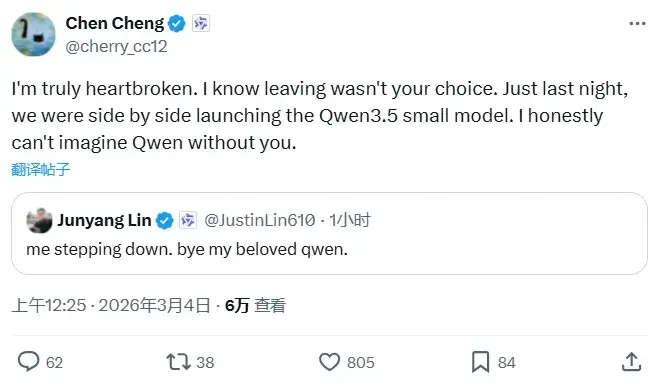 他的同事表示对他的离职很难过,“我真的心碎了。我知道离开不是你的选择。就在昨晚,我们还并肩推出 Qwen3.5 小模型。我真的无法想象没有你的 Qwen 会是怎样。”