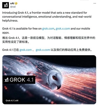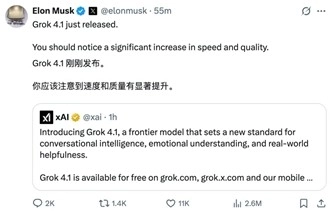 几乎毫无预兆,马斯克人工智能公司xAI发布了最新模型Grok4.1。就在刚刚,xAI宣布,Grok4.1已经向所有用户开放,可以在Grok官网、X以及iOS和Android应用中使用。