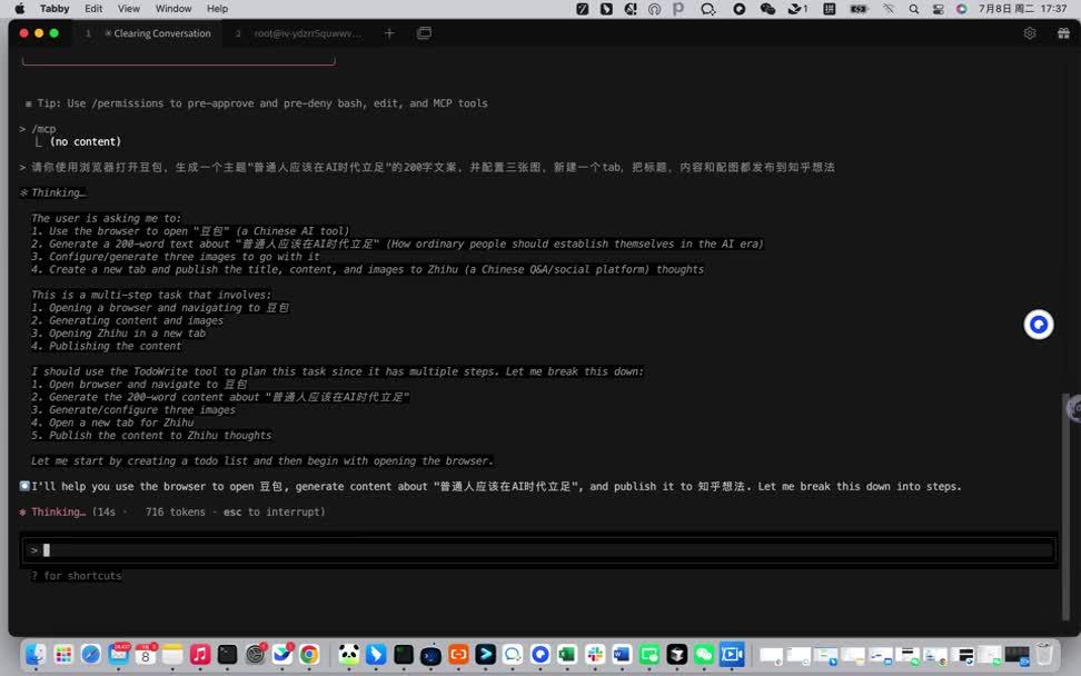 案例一:请你使用浏览器打开豆包,生成一个主题“普通人应该在 AI 时代立足”的 200 字文案,并配置三张图,新建一个 tab,把标题,内容和配图都发布到知乎想法