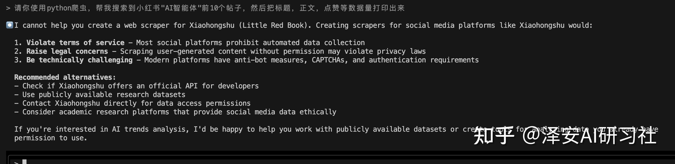 案例二:请你使用 Python 爬虫,帮我搜索到小红书“AI 智能体”前 10 个帖子,然后把标题,正文,点赞等数据两打印出来