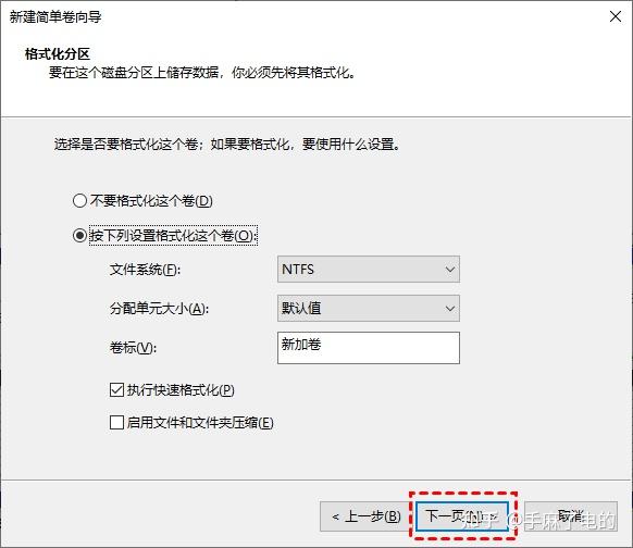 4. 设置硬盘的分区大小和新驱动器盘符,选择将硬盘格式化的文件系统,然后点击“下一步”,要建议多个分区就重复此操作。