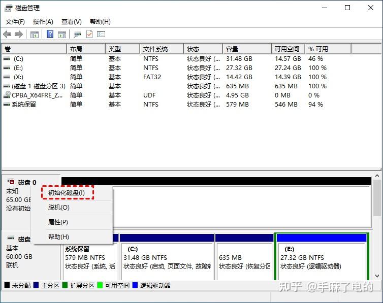 1.“Win+X”选择并打开磁盘管理,右键单击新硬盘,然后单击“初始化磁盘”按钮。