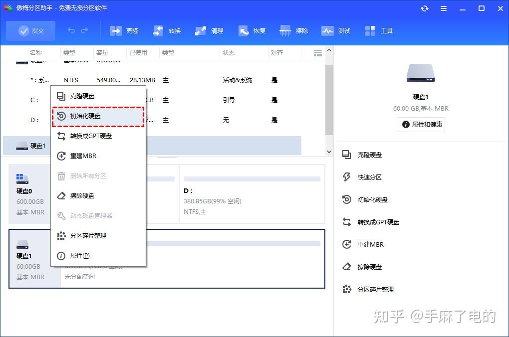 1. 打开傲梅分区助手,在主界面上右键点击新硬盘(容量和新硬盘一致,显示未分配或没有初始化的盘),选择“初始化硬盘”。