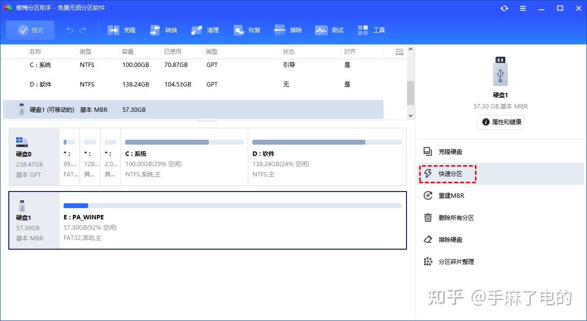 4.初始化完毕后,接着就是分区了,点击新硬盘,点击右侧的“快速分区”。