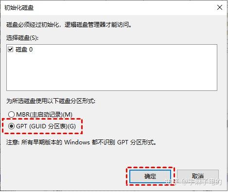2. 再选择分区表格式,首选GPT,老系统可考虑MBR,然后单击“确定”。
