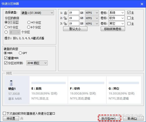 5. 在快速分区神器窗口,确认当前选择的硬盘是否是新硬盘,然后根据需要为新硬盘选择创建分区的数量、容量、类型(首选GPT)、卷标等。确认后,点击“执行”。等待其执行完毕即可。