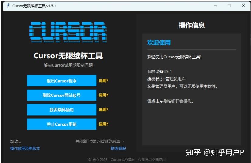 cursor无限续杯软件操作教程软件使用教程 目前软件为 1 5 1 版本 请持续关注 首先是软件链接 点击访问 软件界面 激活成功教程流程 退出 cursor 软件的账号 点击 log out 按钮 可以手动退出并关闭软件 删除账号 点击按钮会自动打开网页 手动删除即可 确保账号退出及程序关闭的情况下点击 我要续杯 的按钮 重新打开 cursor 软件 点击登录即可 这时会跳转到网页让你登录