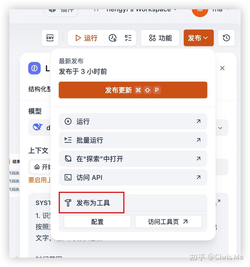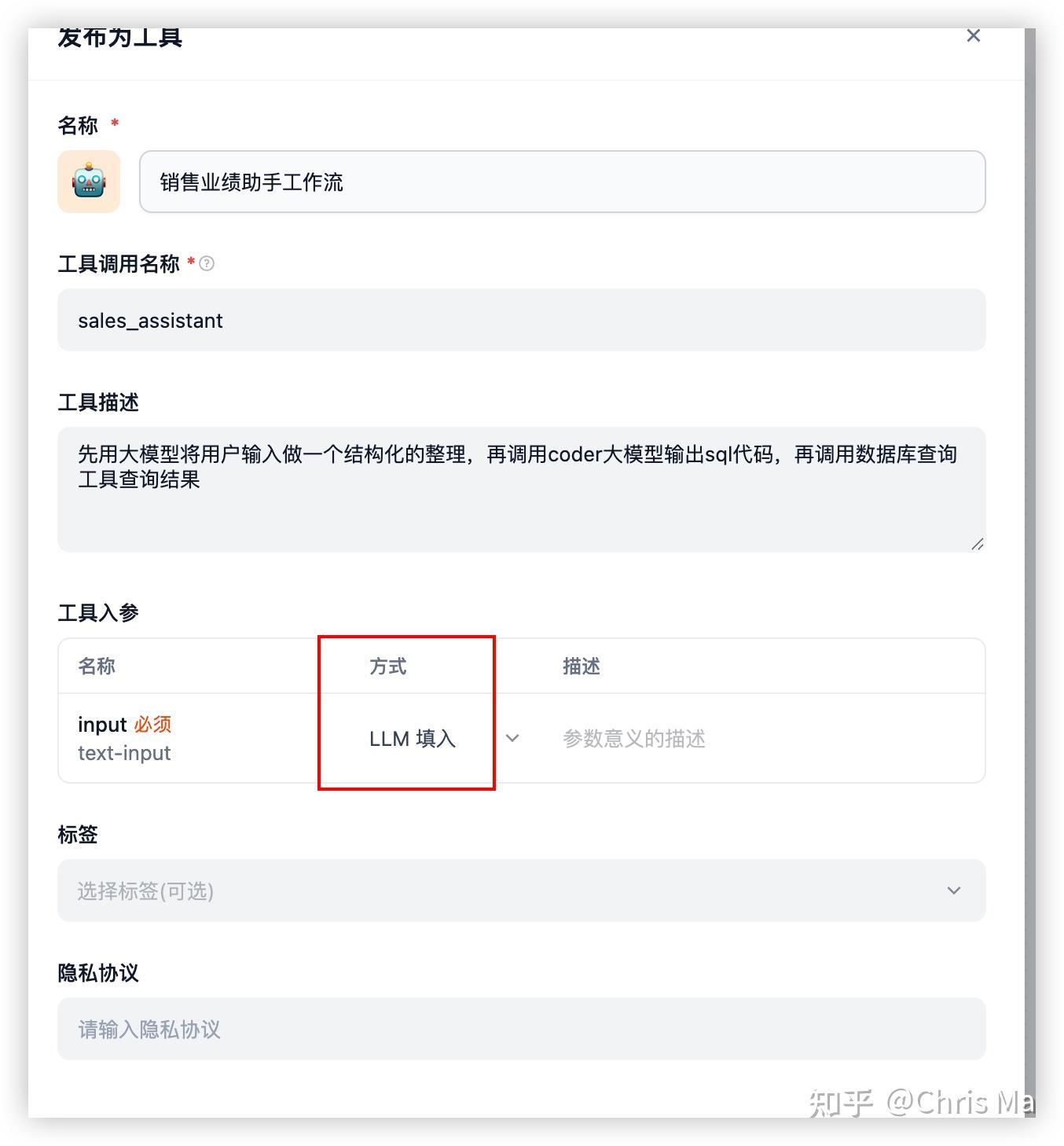 注意上图的工具入参方式,有两个选择,一个是LLM输入,一个是用户输入。我一开始选择的是用户输入,但在agent中,这个工作流不起作用,改成了LLM输入才在agent中起了作用。
