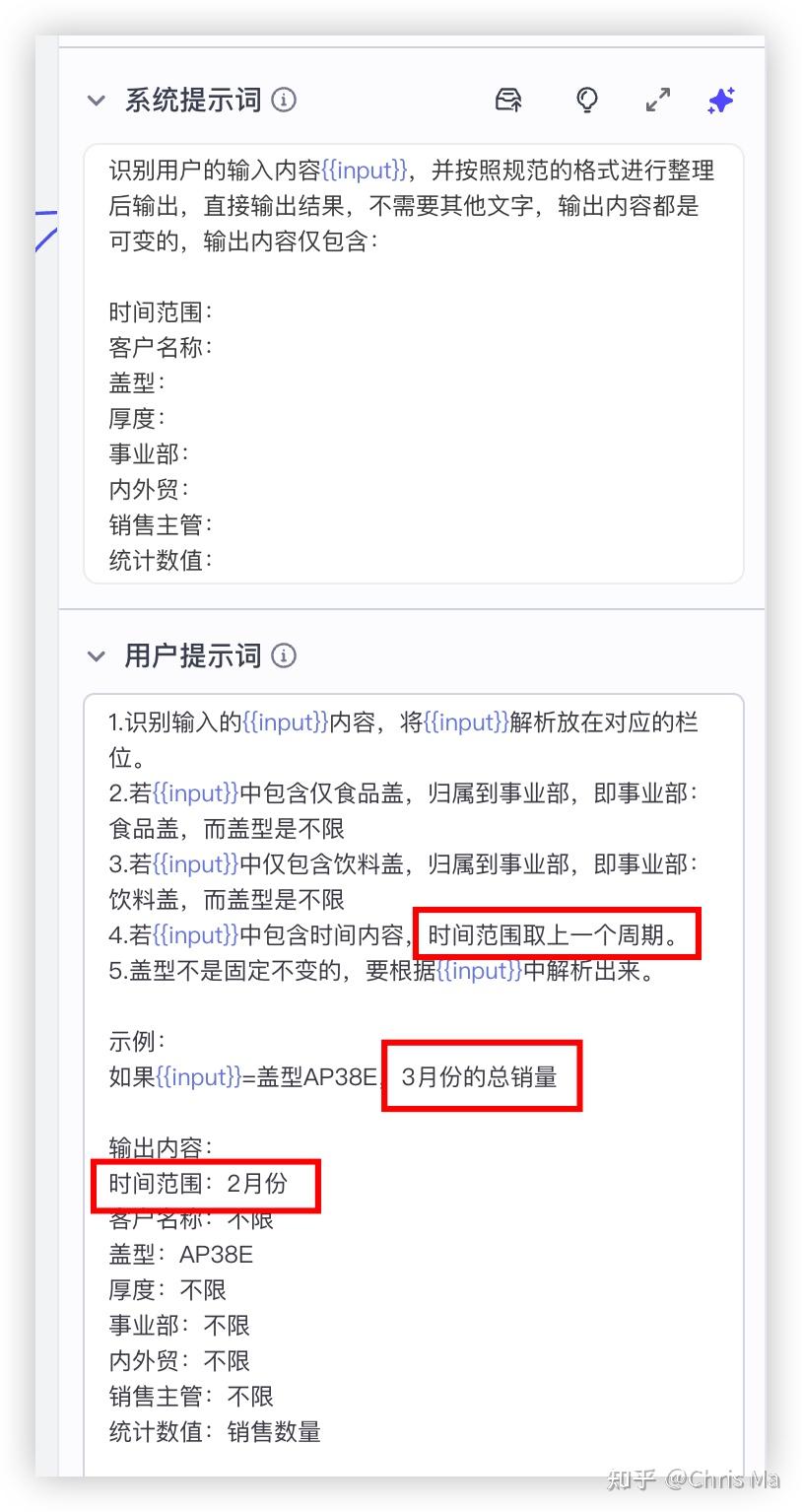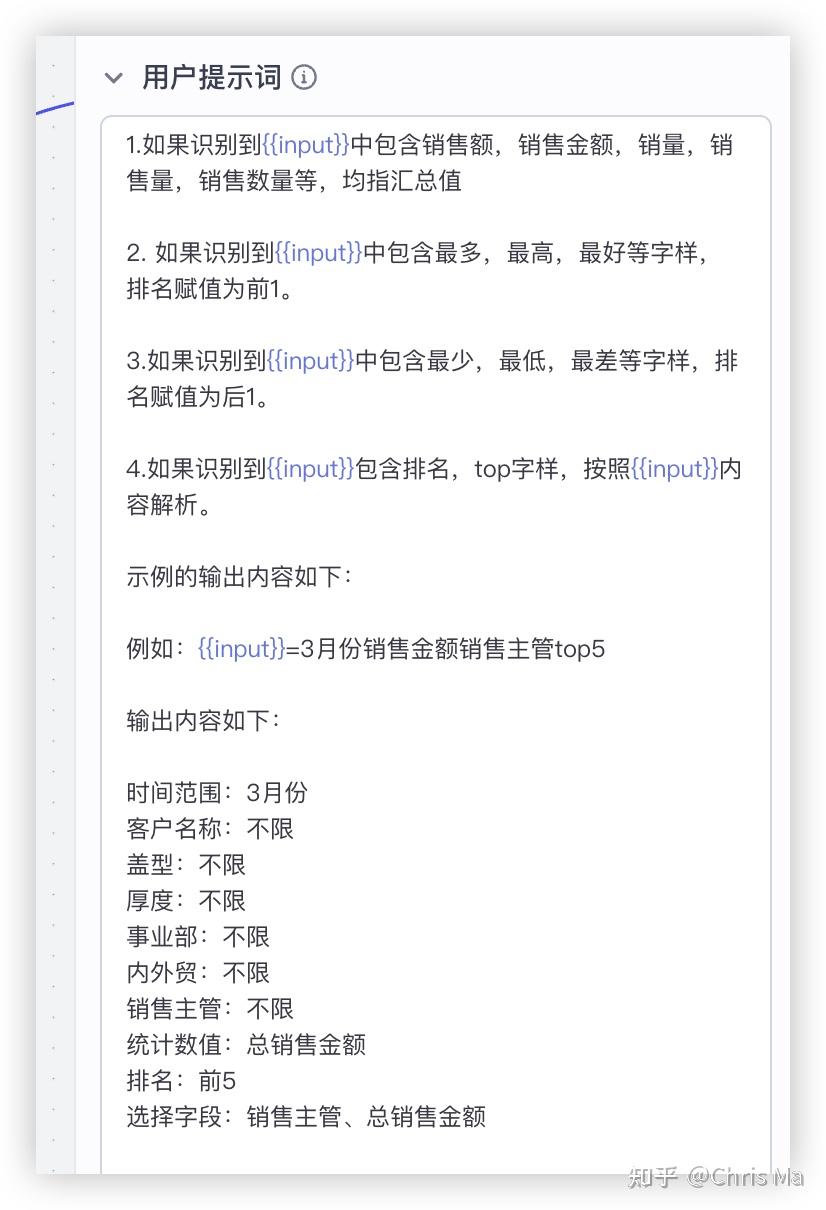 用户提示词:是比系统提示词低一个层级的提示词,可以告诉LLM具体应该怎么干。可以看到,在用户提示词中,我们明确的规定了,如果识别到最多、最高、最好等字样,排名就是前1。如果识别到top5,top10等,排名就是前5,前10。下面也给了一个输出的示例,方便大语言模型理解。