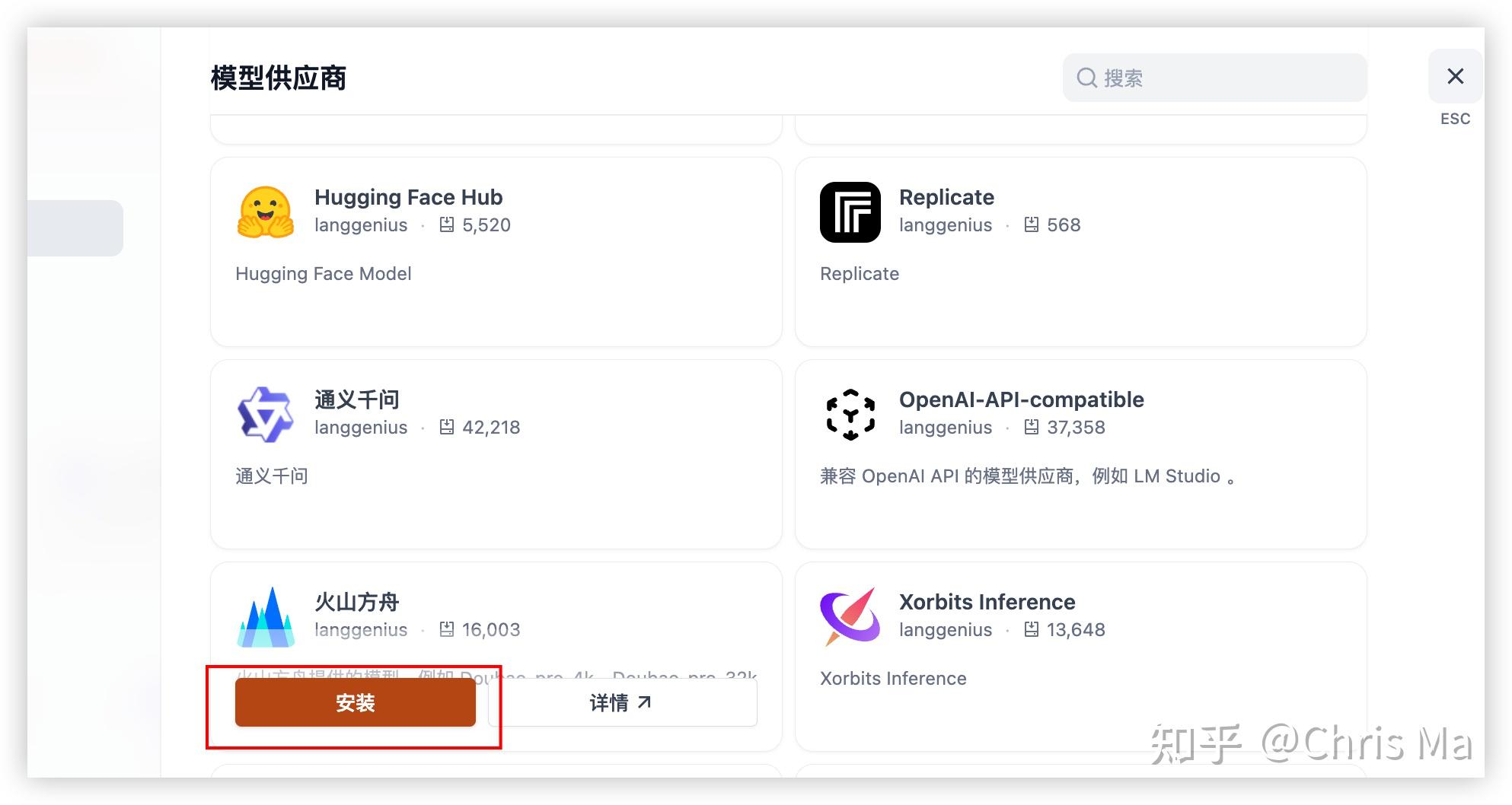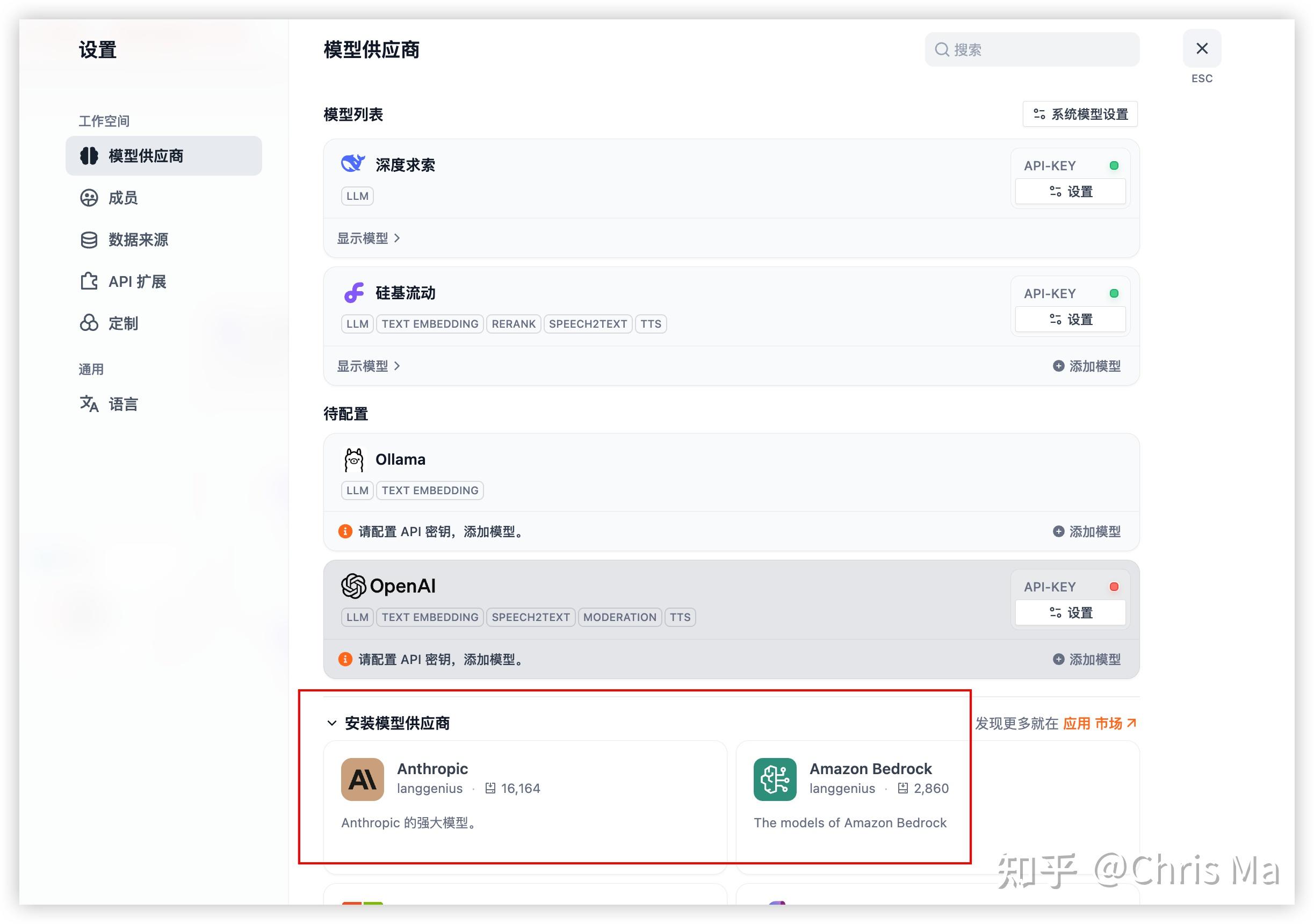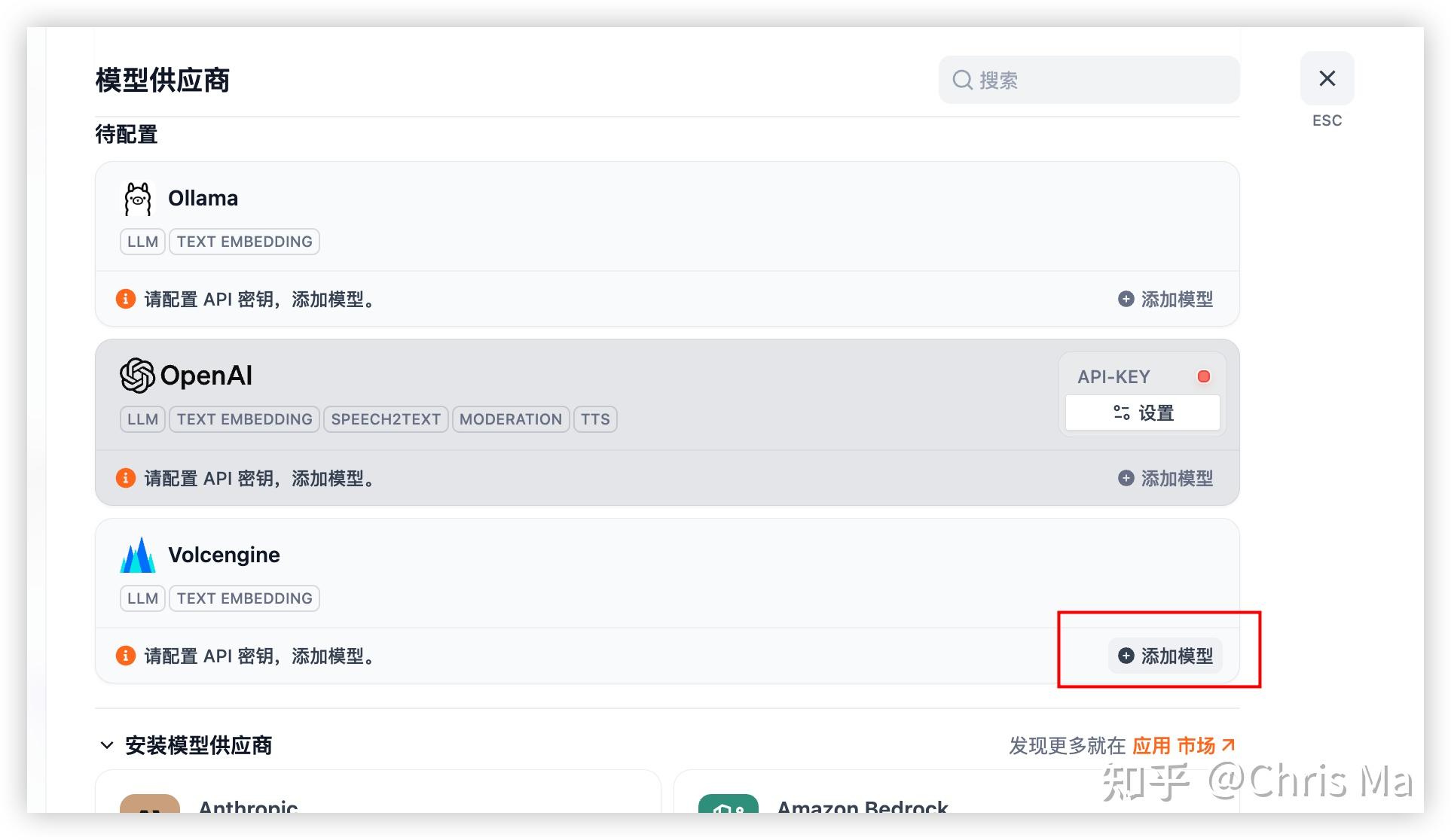 从下面的模型供应商中选择你想要使用的大模型,进行安装。