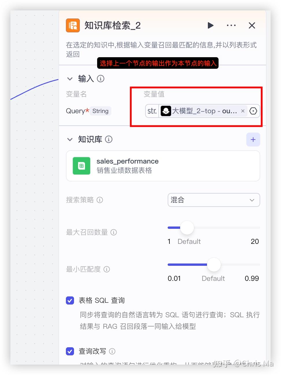 2. 知识库检索_2这个节点,是将上一个LLM节点输出的内容转换成SQL代码并查询表格中的数据。我们看一下里面的具体设置: