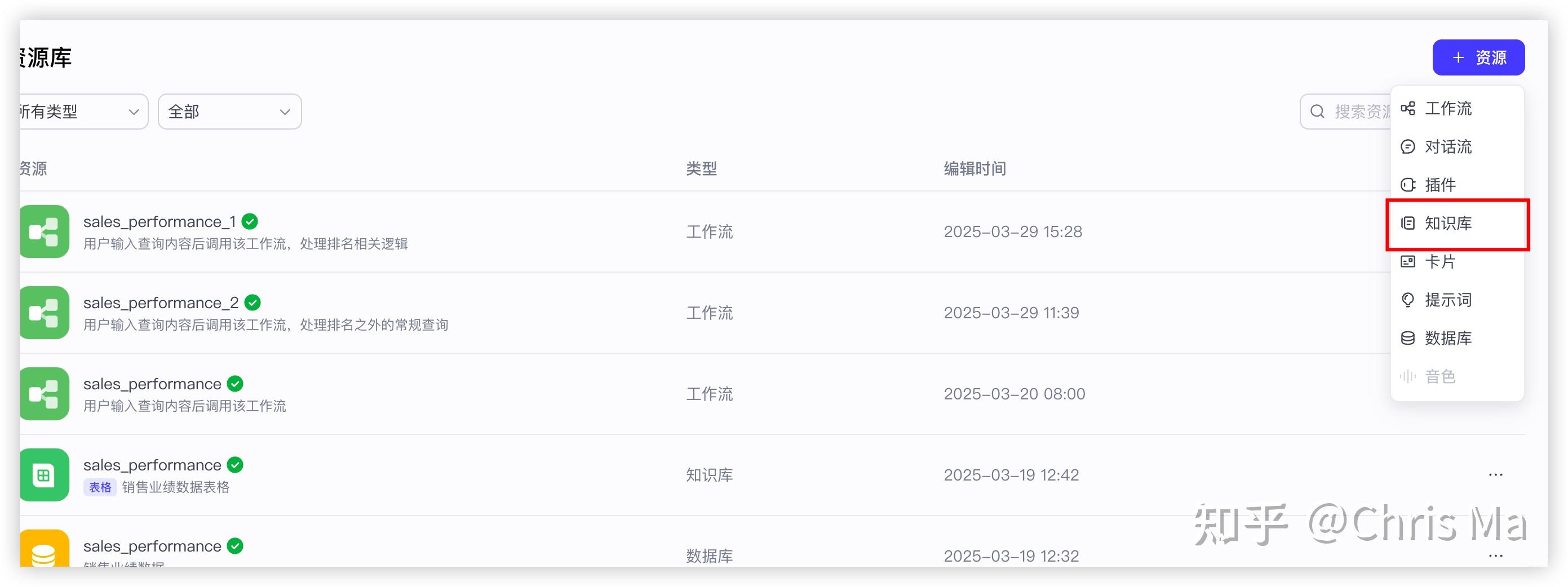 可以看到,上图中还有一个知识库:sales_performance,销售业绩表格数据,这个知识库是要提前创建好的。事先在线下准备好一个数据表格,包含销售业绩的数据,然后创建知识库上传。