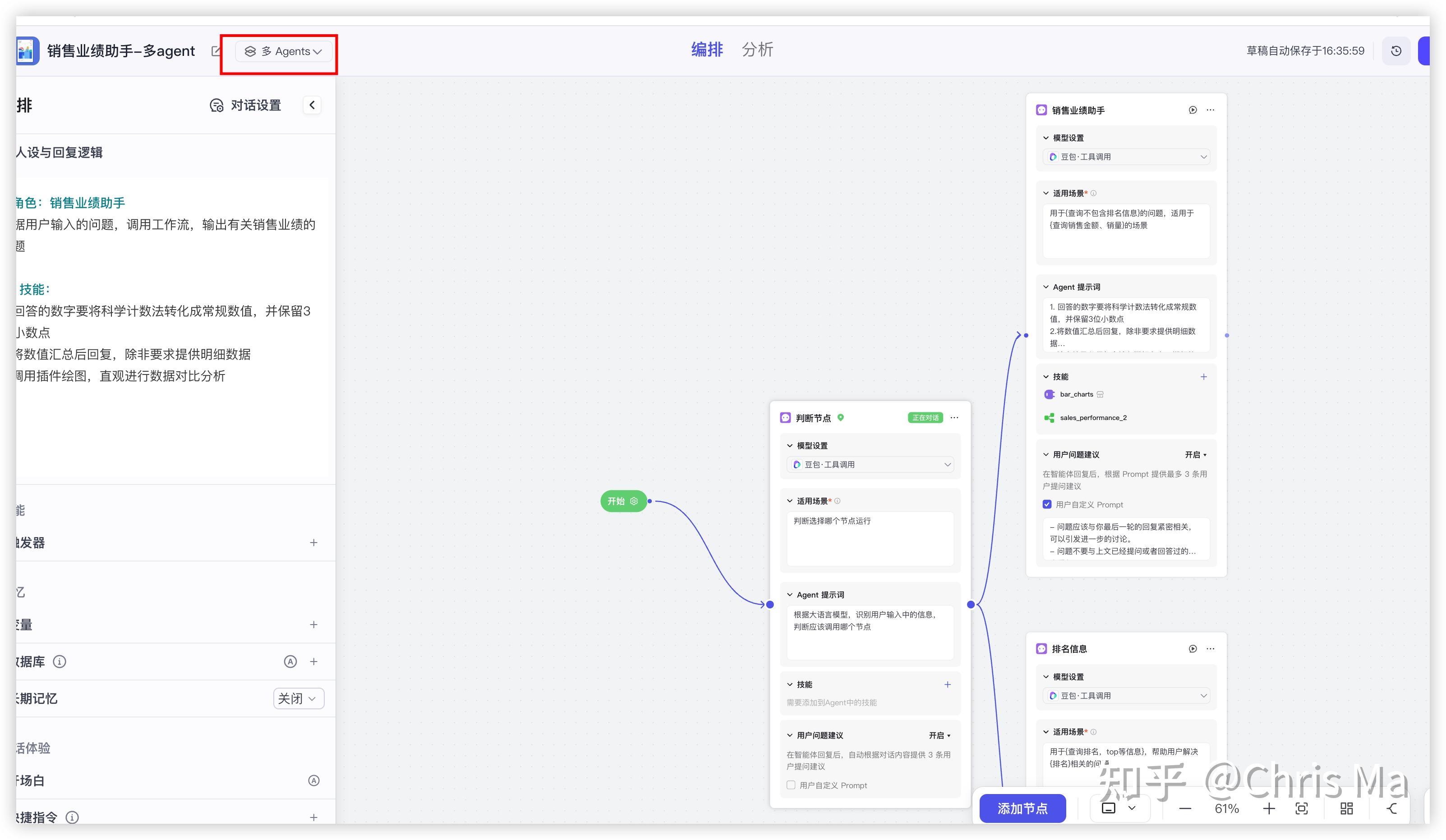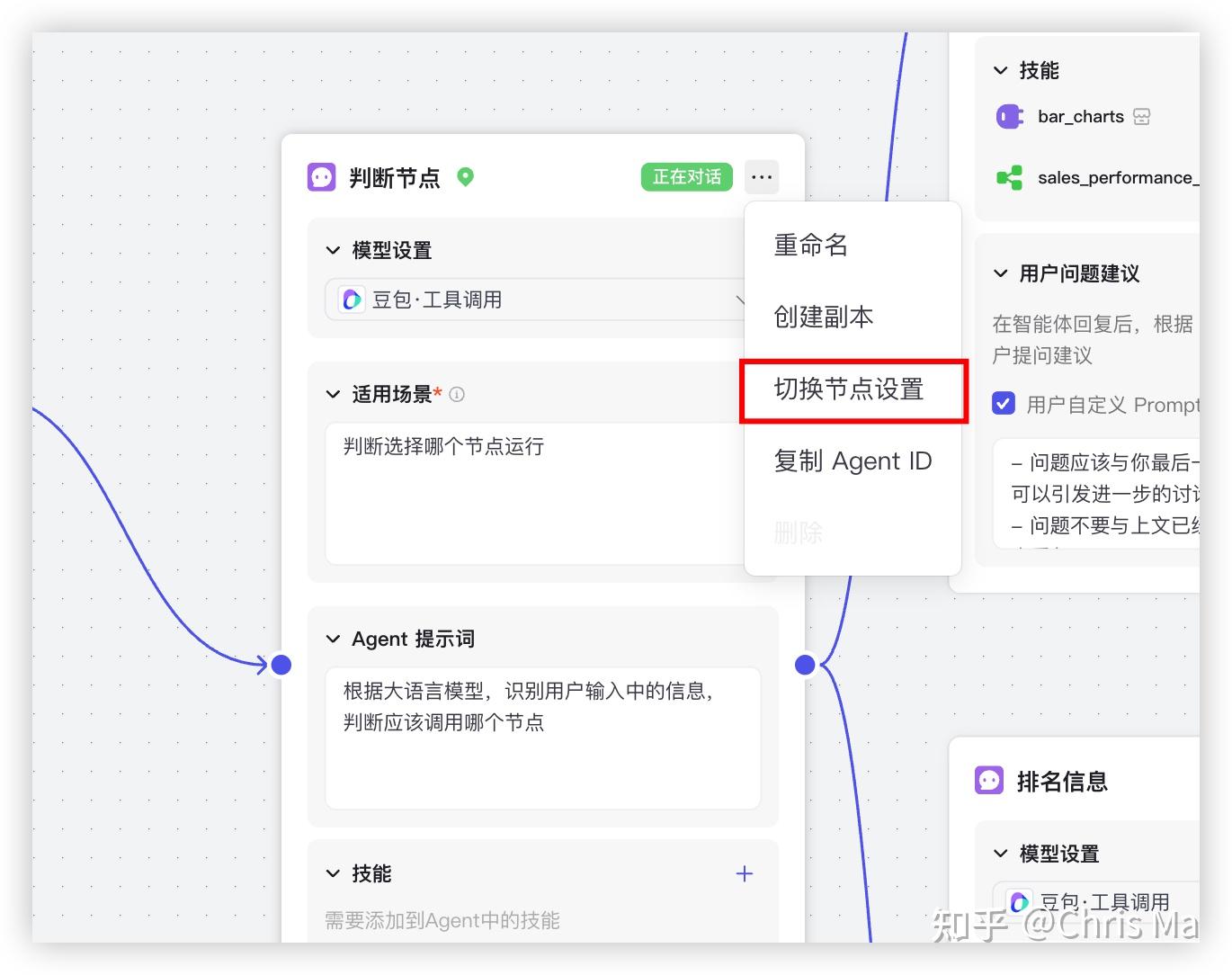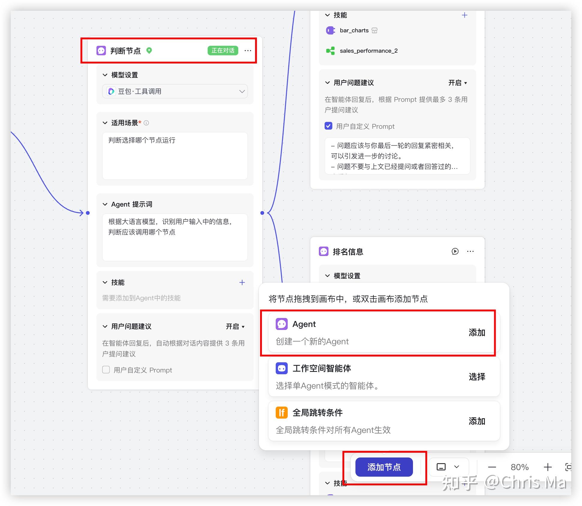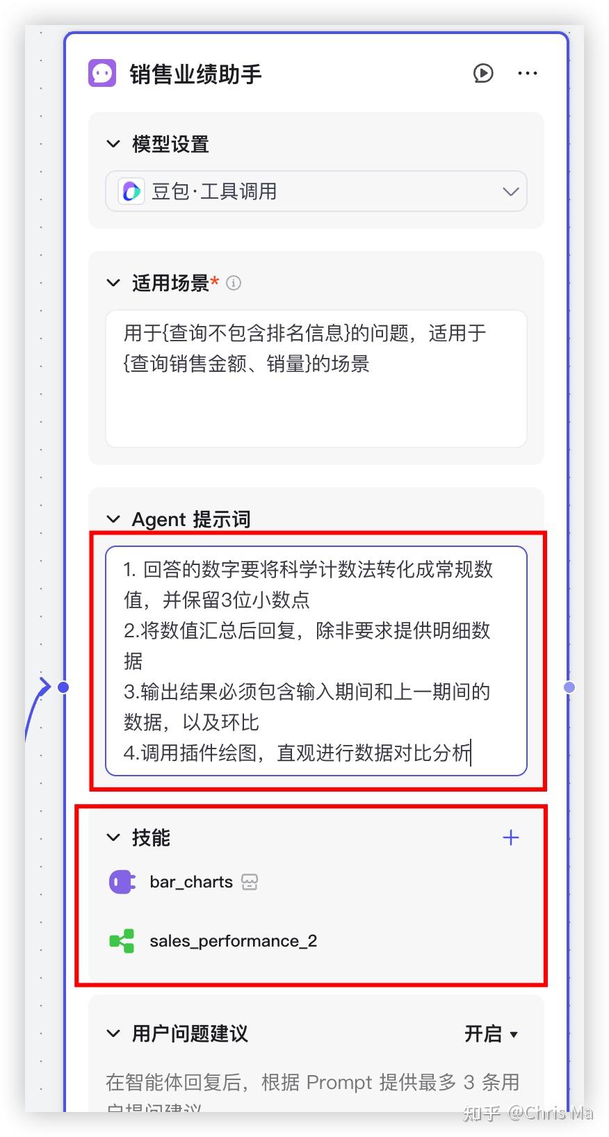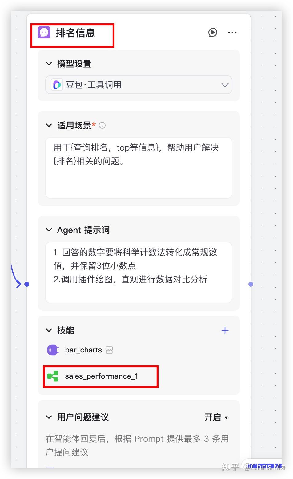 对于常规查询智能体,我们需要调用sales_performance_2这个常规查询的工作流,并且有结果之后,我们希望画个柱状图进行展示,因此再加一个技能插件:图标大师中的柱形图。