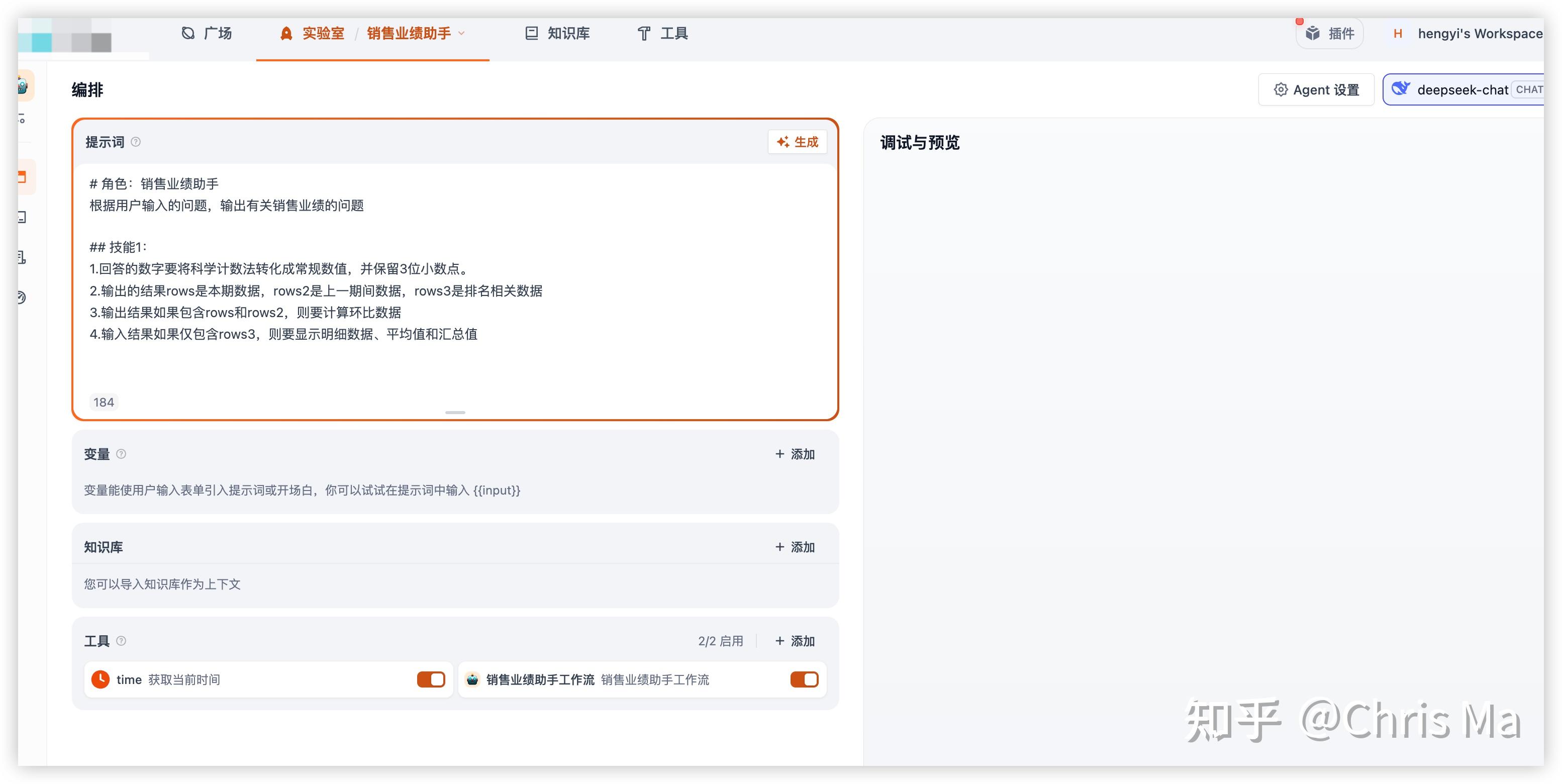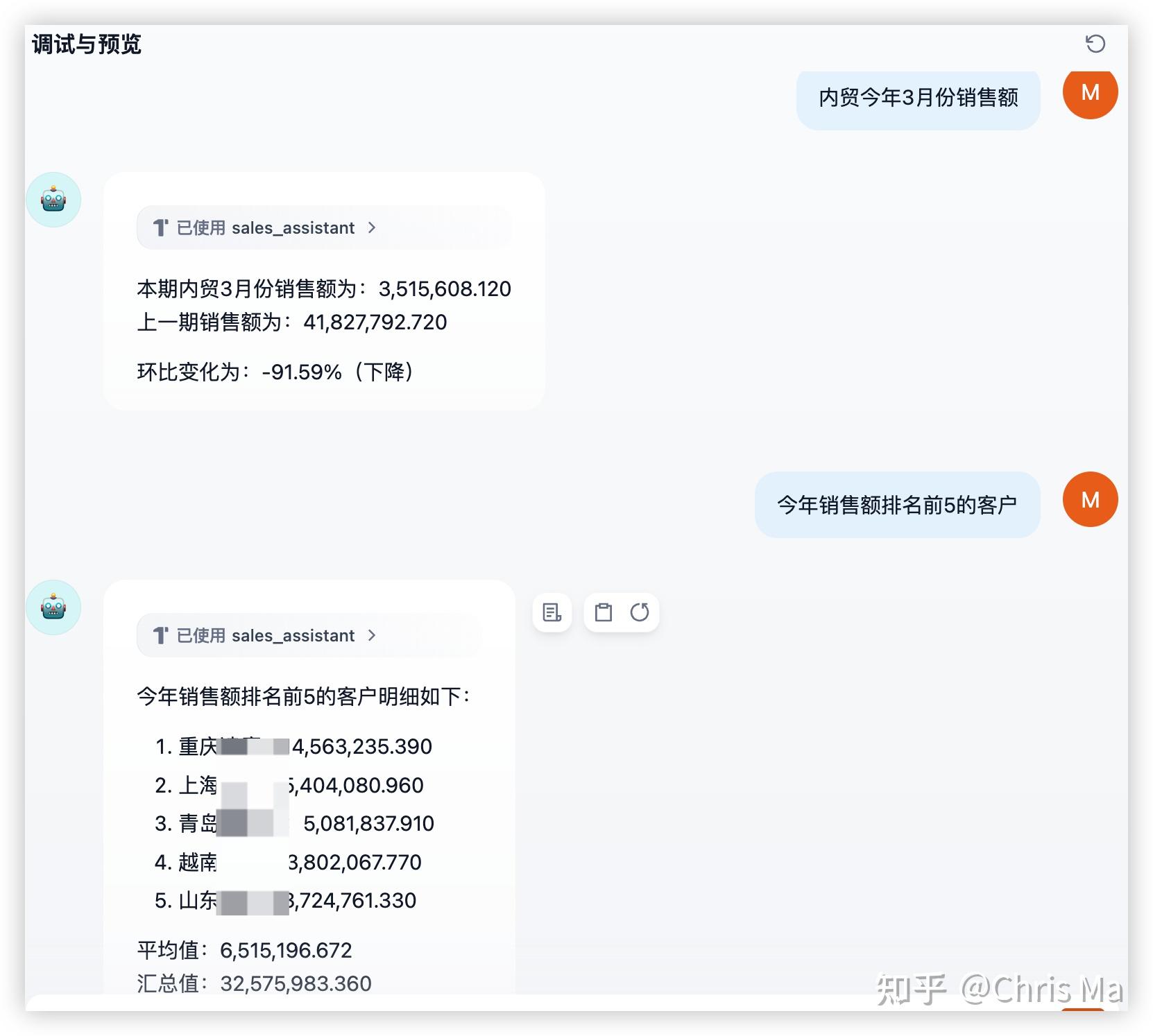 - 智能体功能:回答有关销售业绩的问题,多维度和视角解答有关销售数量、销售金额的统计、对比分析。