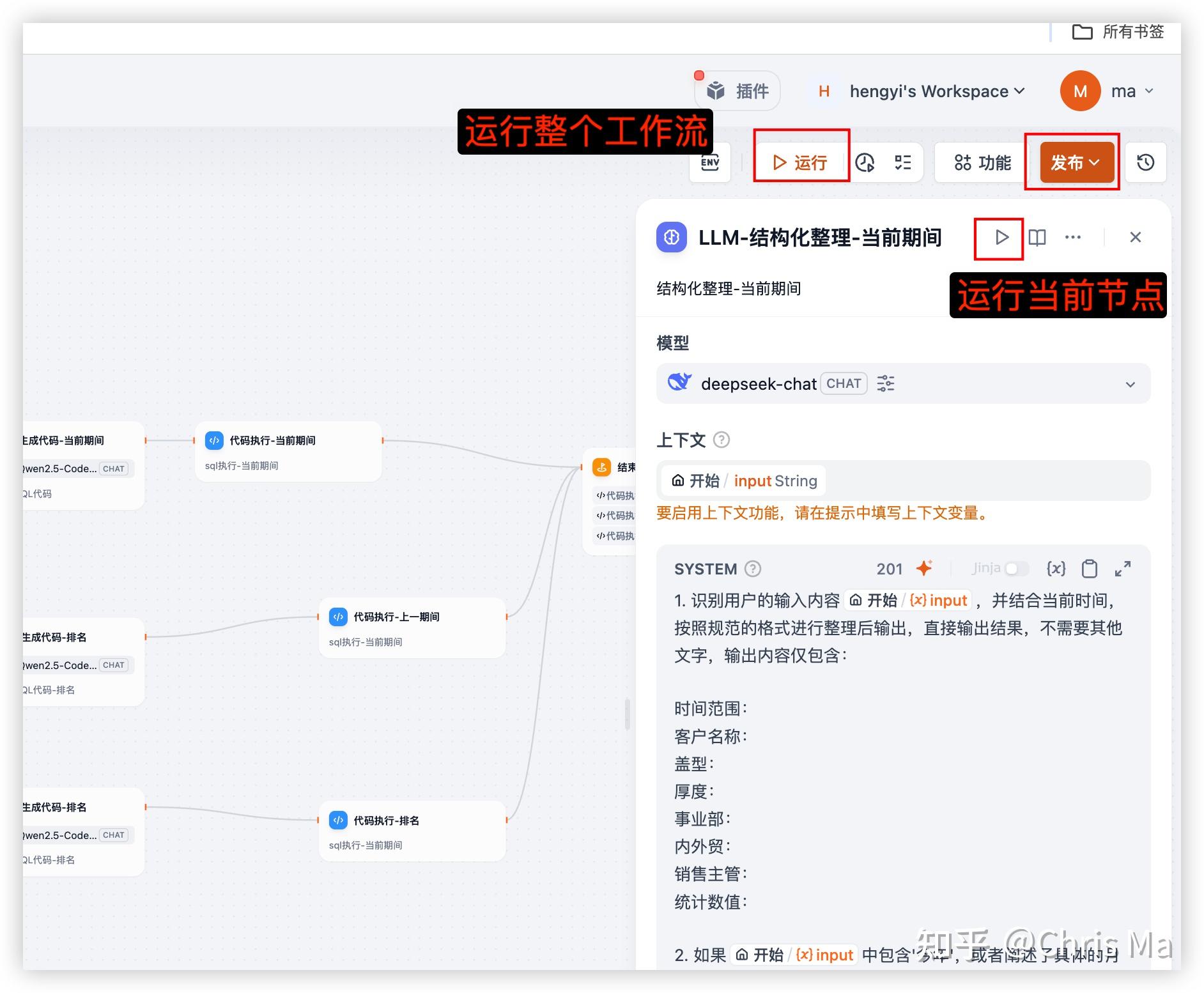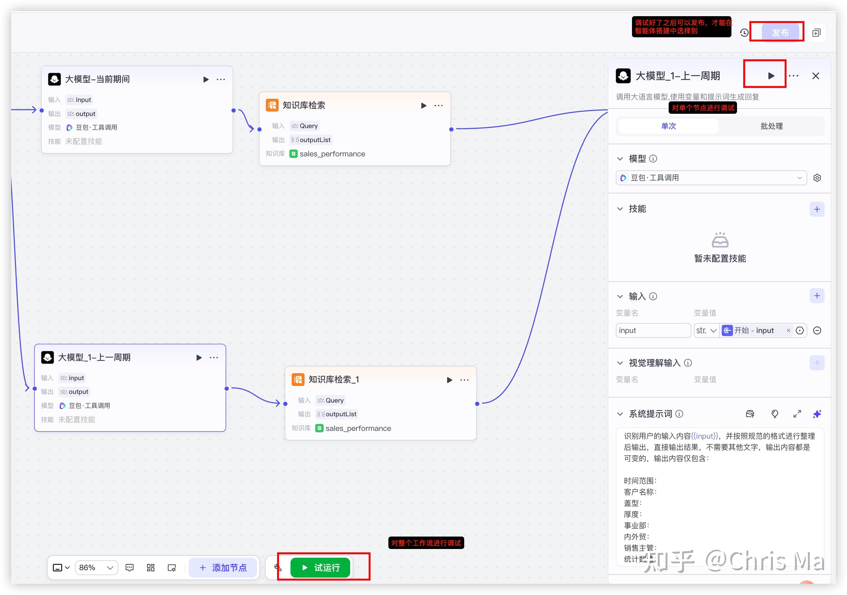 工作流设置中,可以试运行某个节点和整个工作流,在可被agent调用之前,一定要先发布。