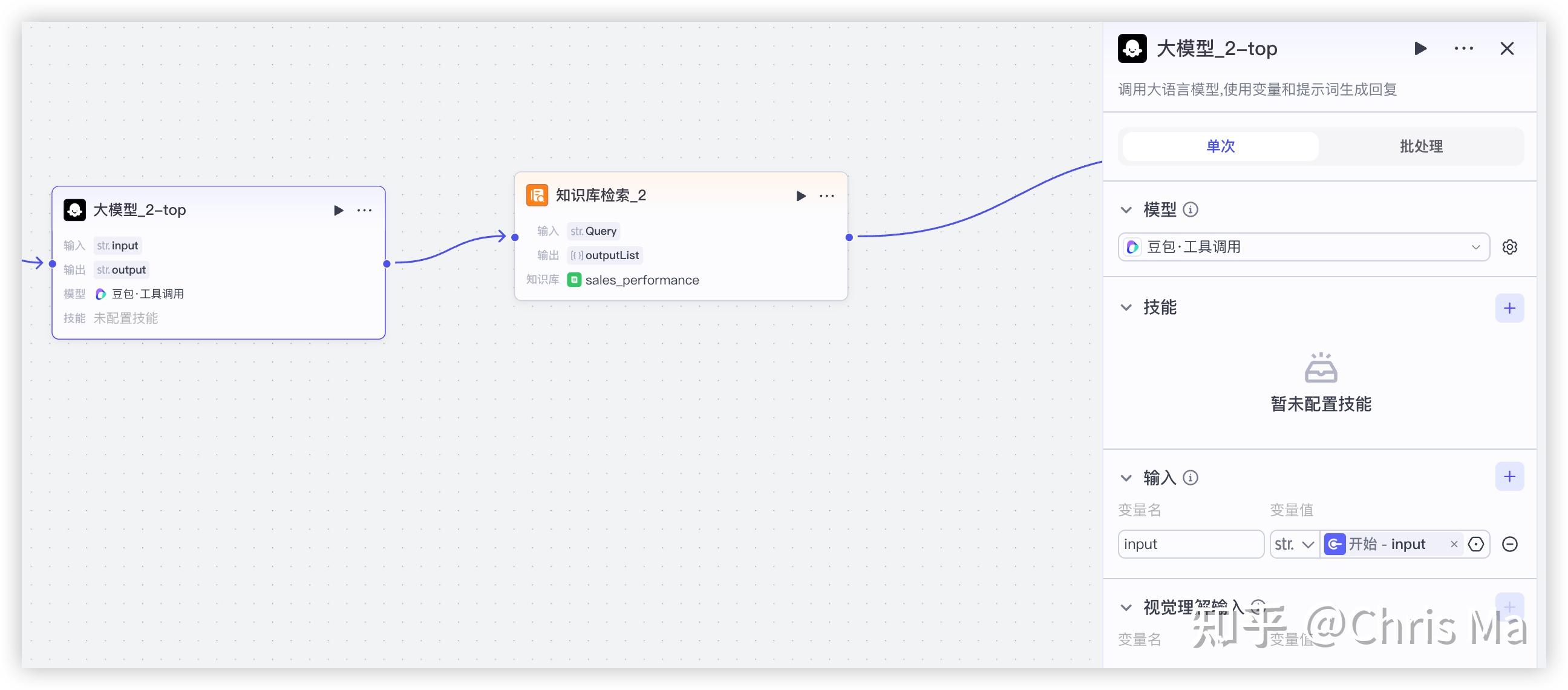 首先在右侧,可以选择调用的模型,我们这里选择豆包。然后对于这个节点,它的输入是什么,无疑是开始节点的input。