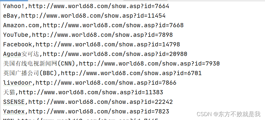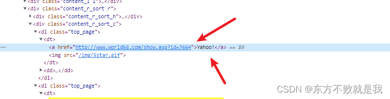 world.encoding,设置了网页解析编码;world.html.find('dl>dt>a')通过 css 选择器,查找所有的网页标题元素;item.text提取网页标题内容;item.attrs['href']获取元素属性,即网站域名