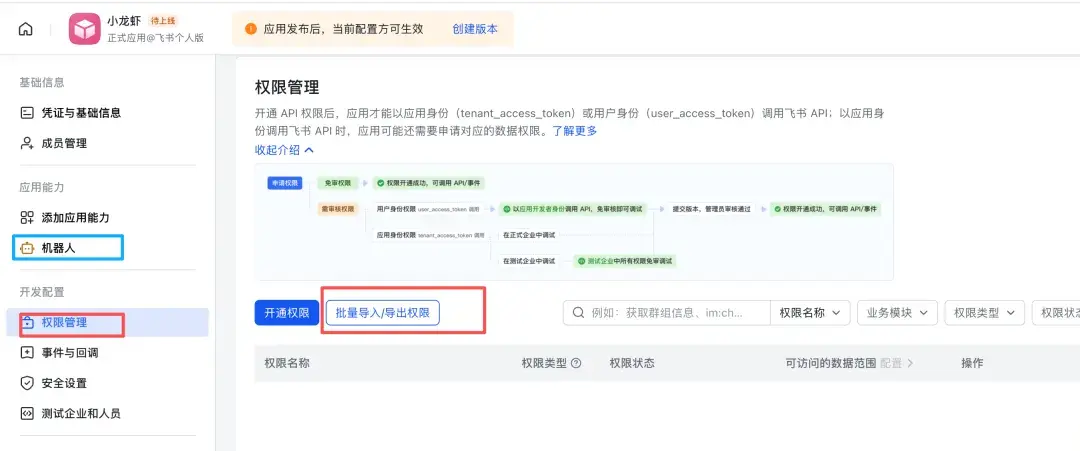 在左侧目录树选择“开发配置 > 权限管理”,单击“批量导入/导出权限”按钮。