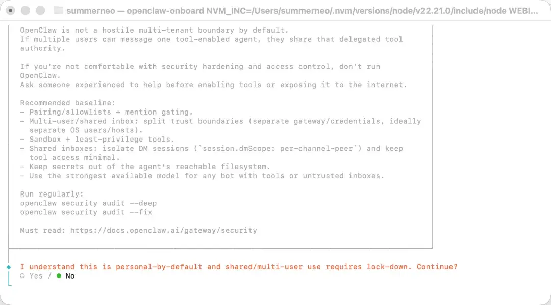 默认这是给“个人使用”的环境,如果要多人共用,需要额外做安全加固。是否继续? 直接输入: Y