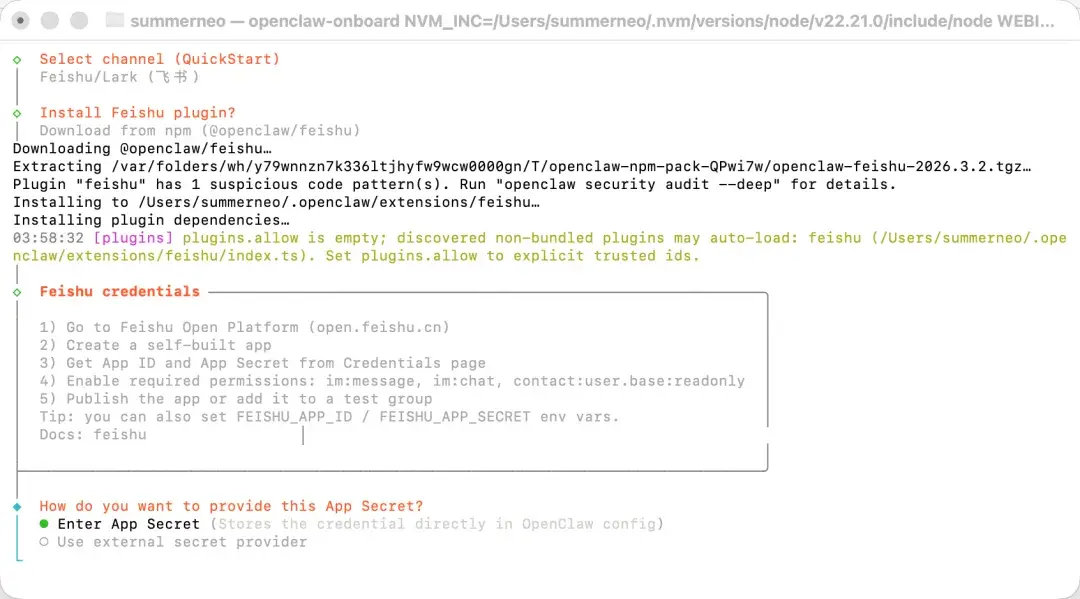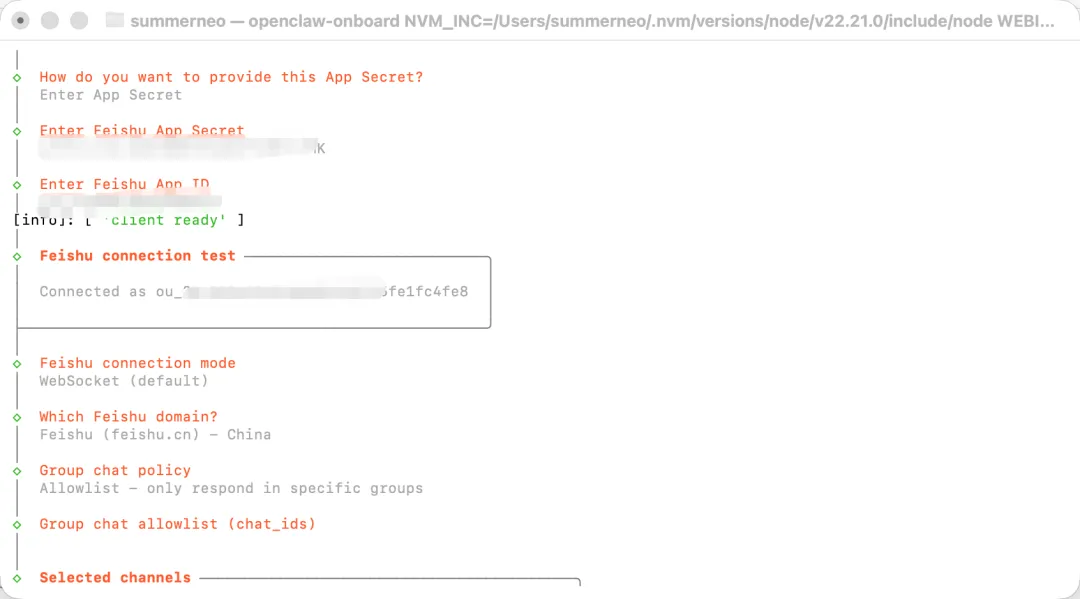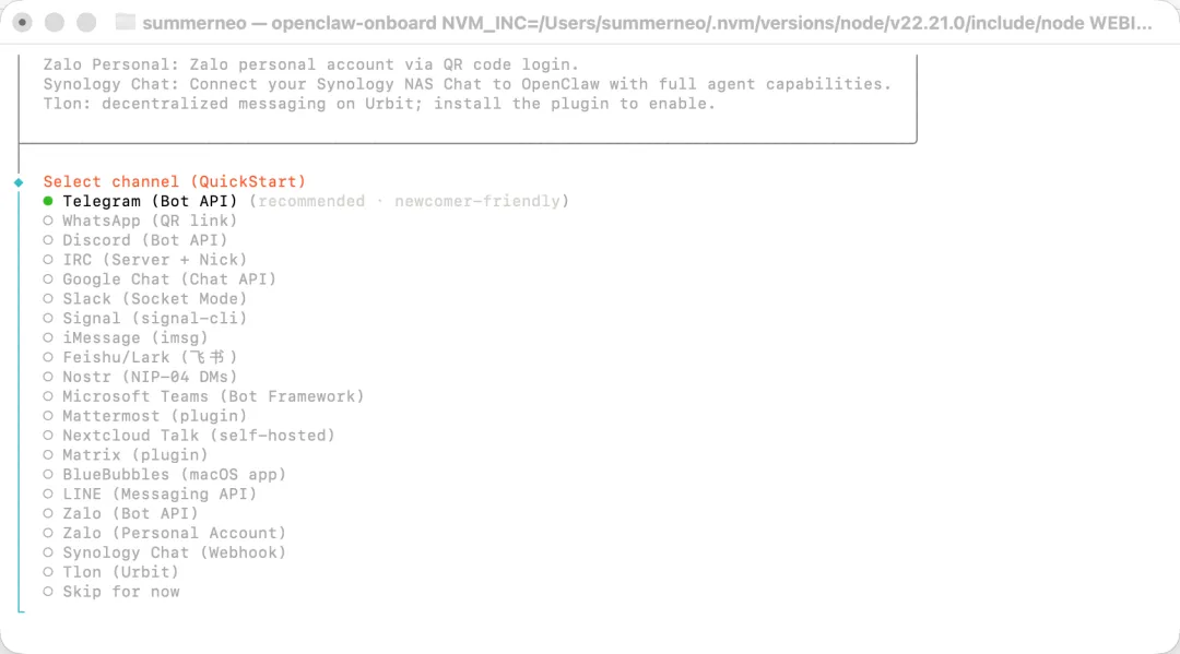 接下来让你选择接入的社交软件,支持 Telegram\飞书 等各种软件,我们这里以飞书为例。