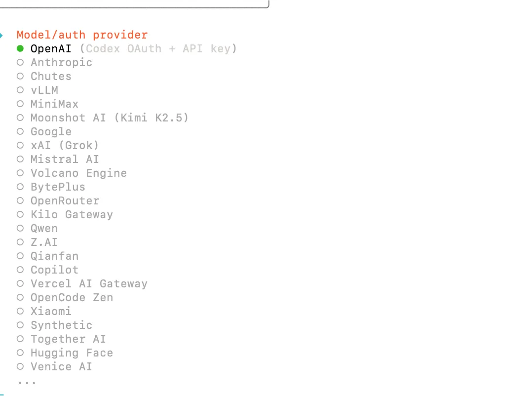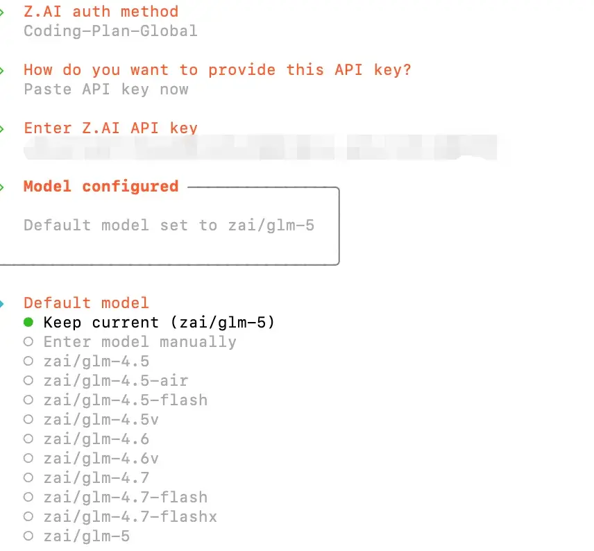 接着上一步,根据提示选择模型Z.AI(就是智谱),选择不同的 Method,选择输入 API key