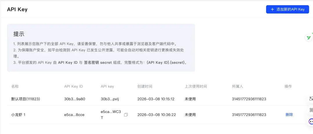 创建一个小龙虾1的项目,专业系统会自动一个 API key ,右侧有一个复制的按钮,点击复制就可以拿到完整的 API key 了。