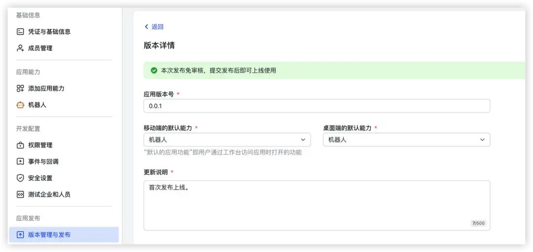 单击页面底部的“保存”按钮,创建版本。单击页面右上角的“确认发布”按钮,完成应用发布。