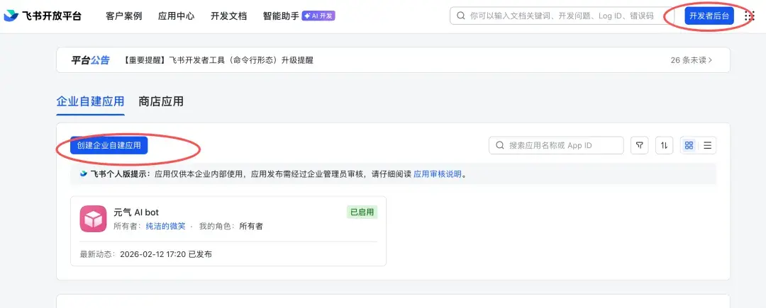 登录飞书开放平台 https://open.feishu.cn/,登录后进入开发者后台 创建应用。