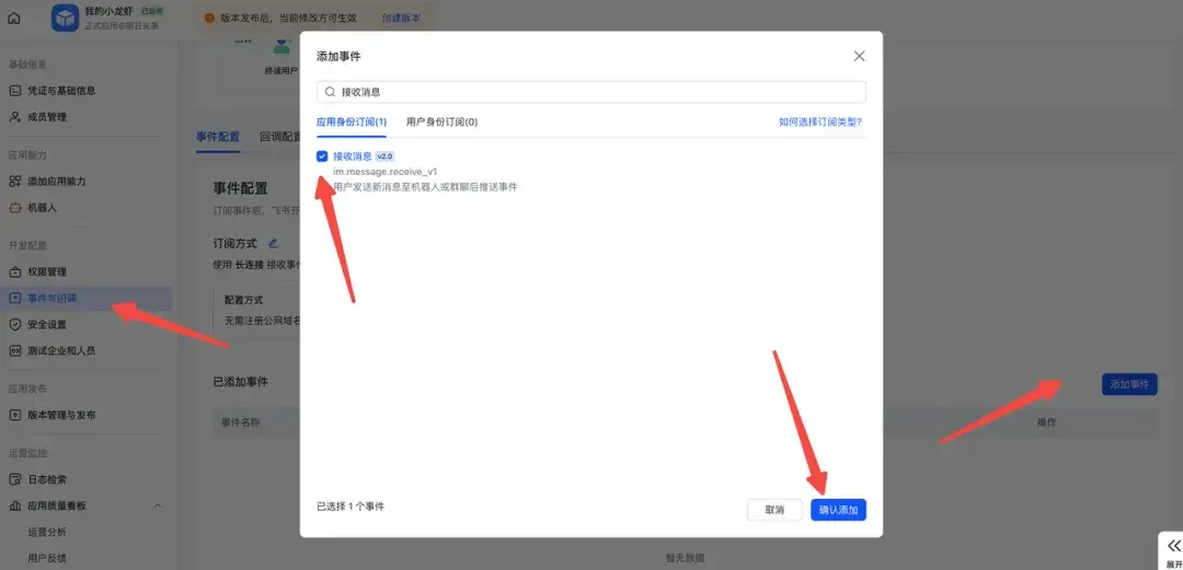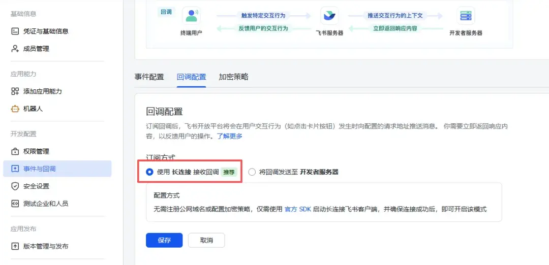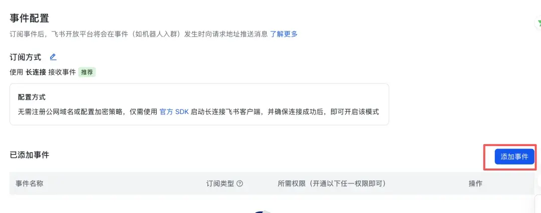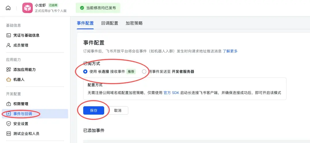点击左侧菜单 事件与回调 ,在事件配置中设置订阅方式,使用长连接