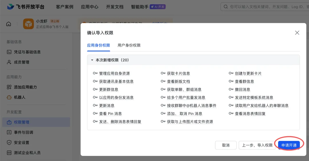 在弹窗中确认权限无误后,单击“申请开通”按钮,完成操作。
