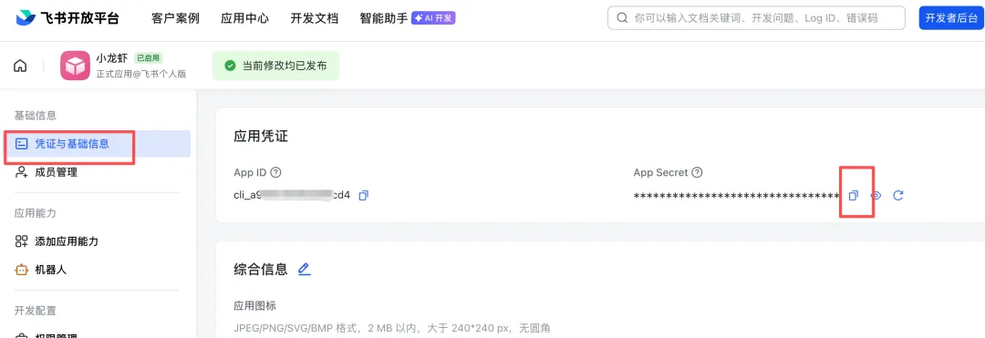- 在“应用凭证”模块中,获取并记录App ID与App Secret信息。