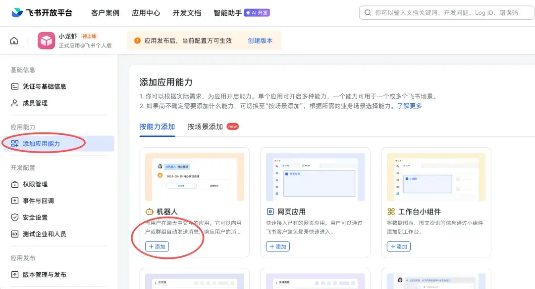 - 选择“按能力添加”页签,单击“机器人”能力卡片的“添加”按钮