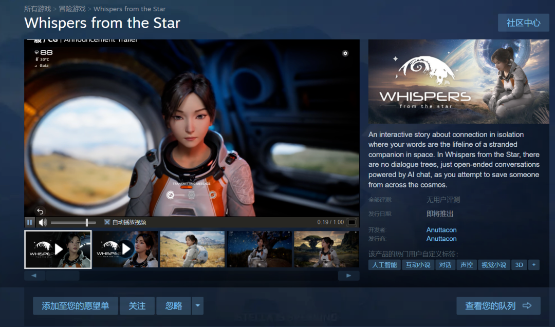 前有破圈的AI陪伴应用EVE,后有蔡浩宇最近发布的AI游戏Demo 《whispers from the stars》