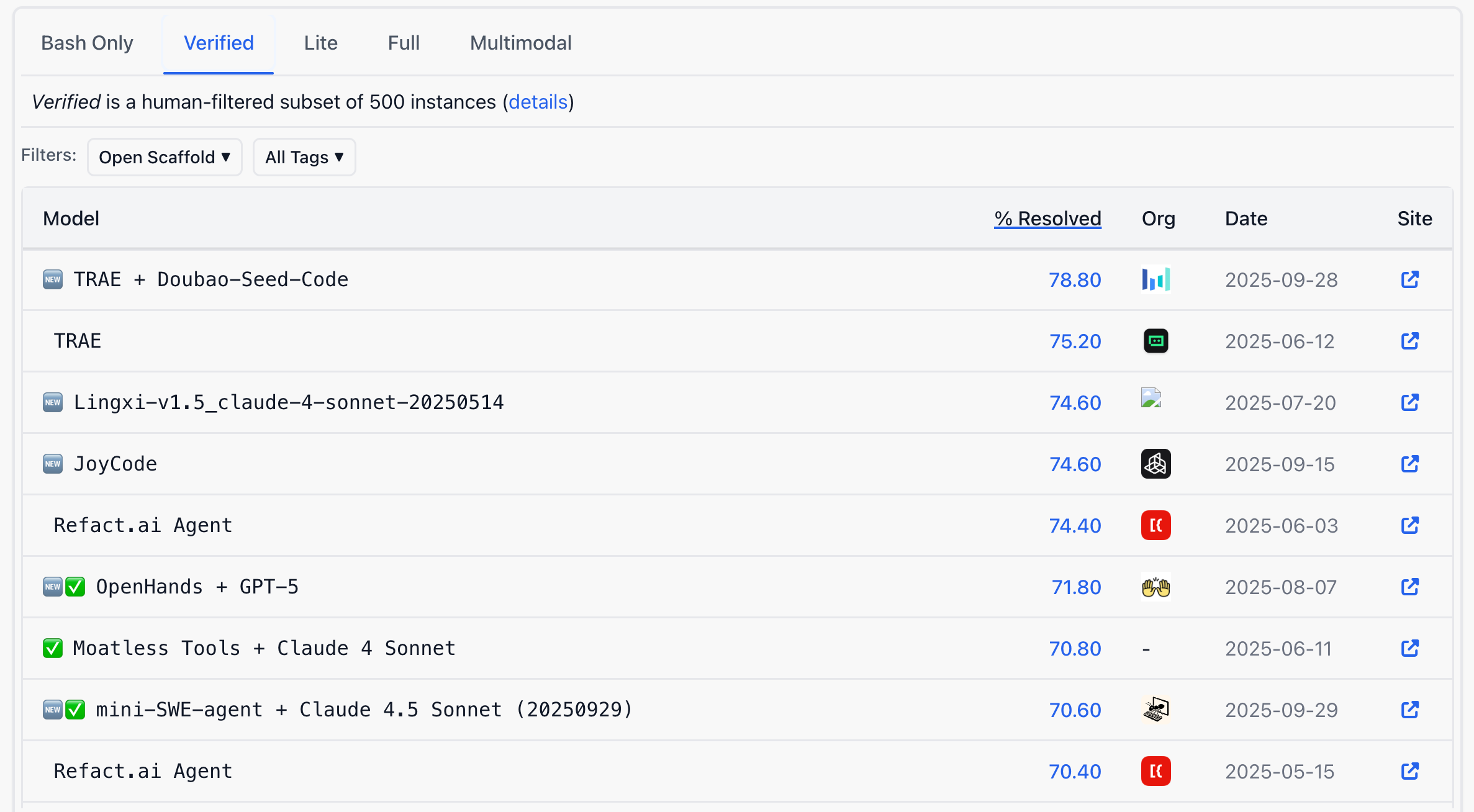 值得关注的是,与TRAE开发环境深度结合后,Doubao-Seed-Code在SWE-Bench Verified榜单中达到78.80%的成绩,取得了新的SOTA,充分验证了模型与工具深度适配后的协同效应。