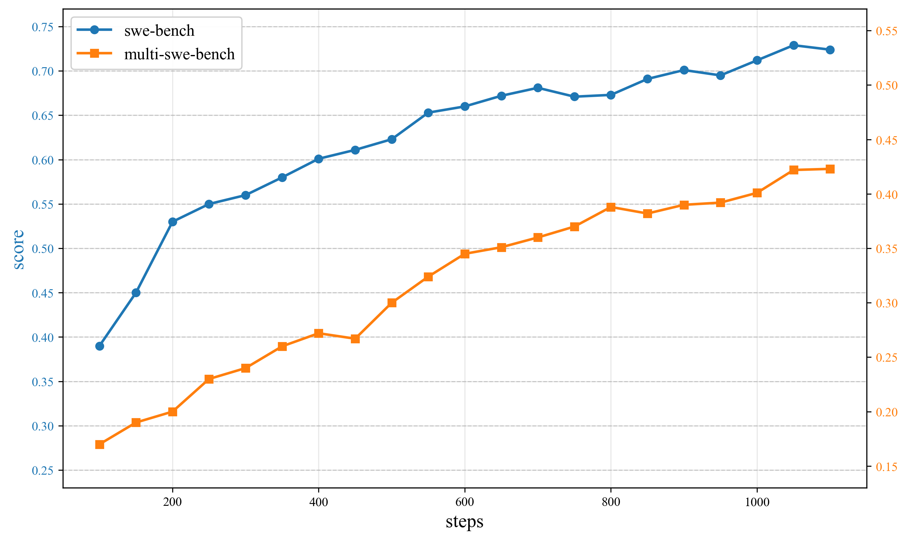 训练结果显示,模型在Multi-SWE-Bench和SWE-Bench-Verified两个数据集上的表现稳定上升,展现出良好的泛化能力。在SWE-Bench基准测试中,仅依赖 RL训练的Doubao-Seed-Code模型就可达到最优水平,表明纯强化学习在真实编程场景下具备潜力。