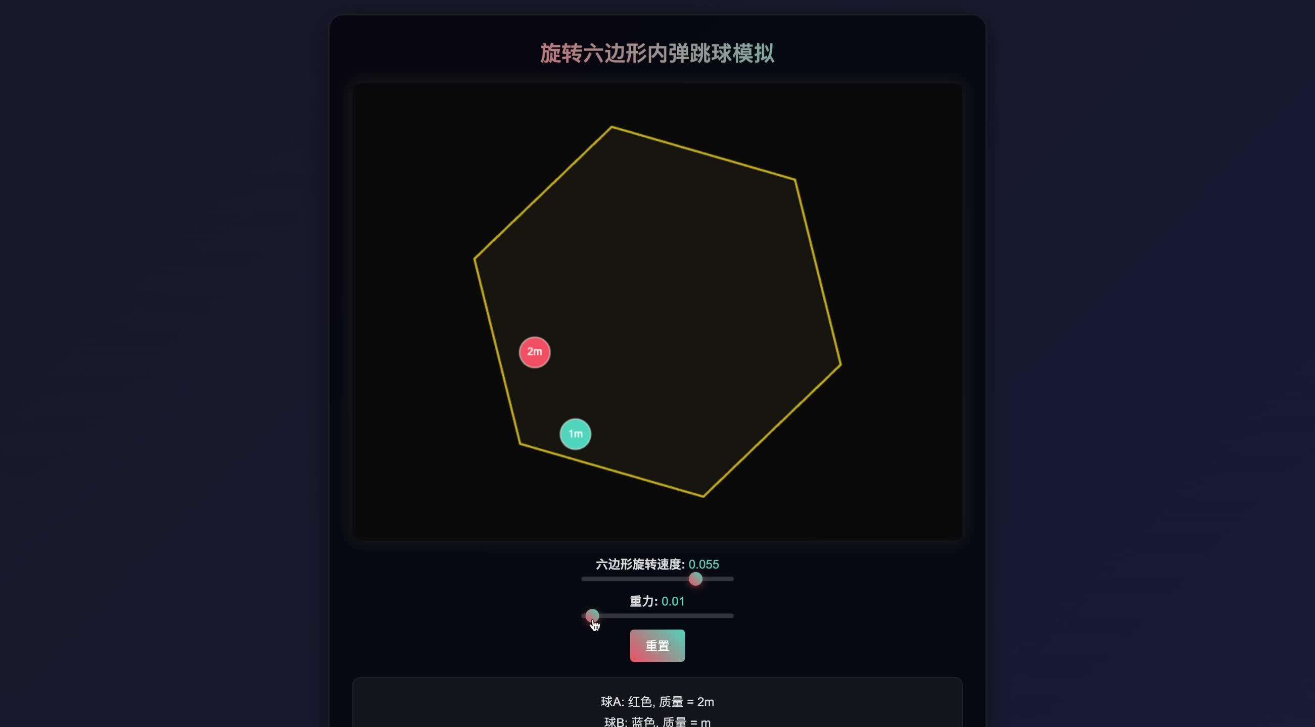 Doubao-Seed-Code在经典旋转六边形小球弹跳测试中,物理引擎与动画渲染丝滑配合,完整实现动态模拟