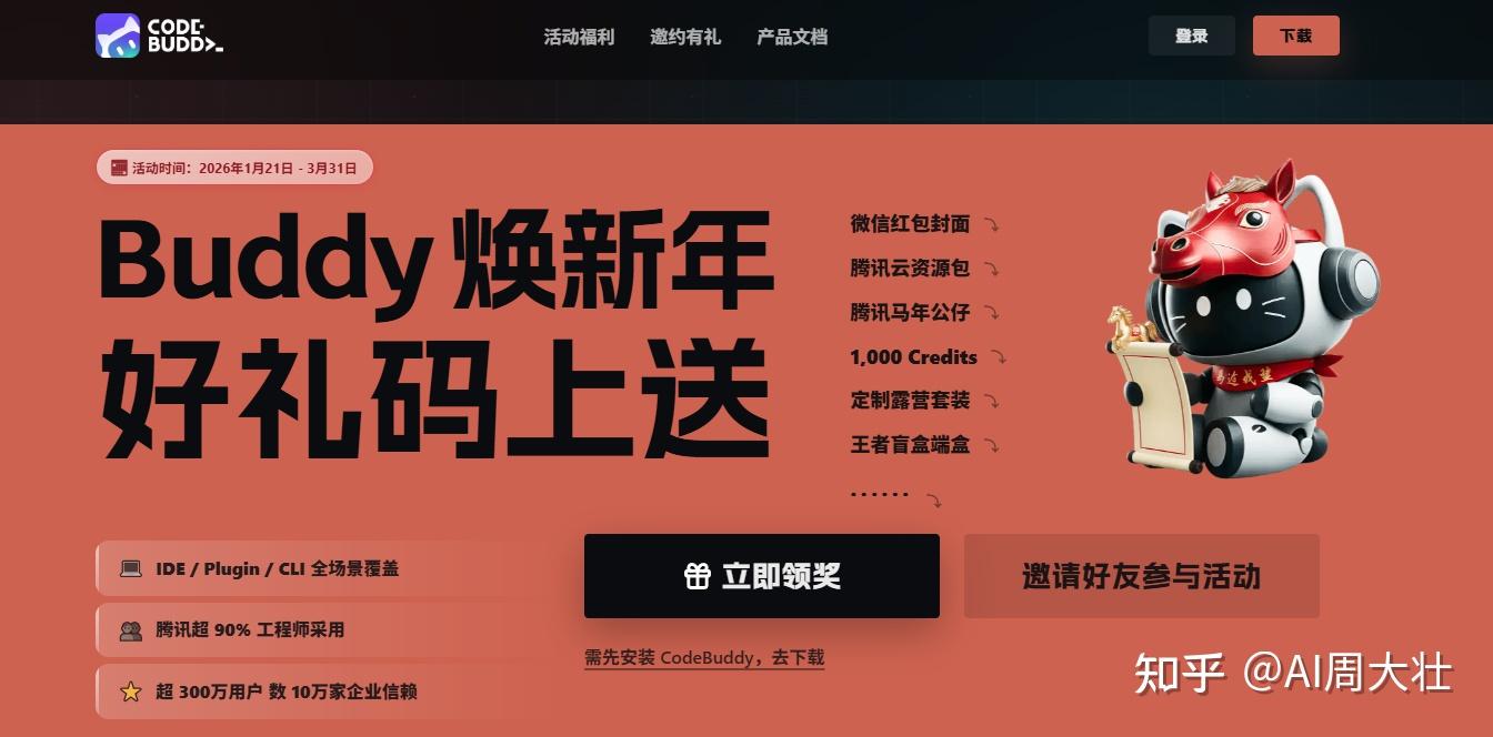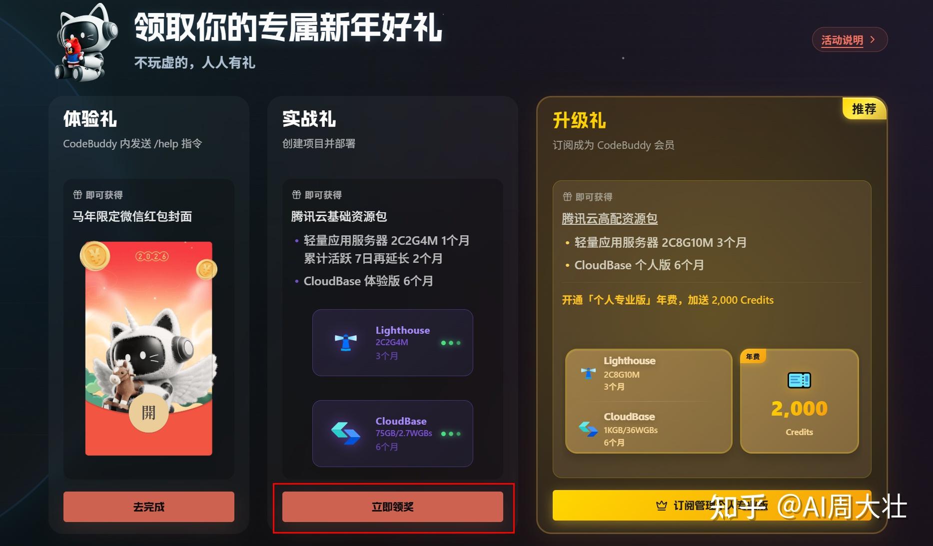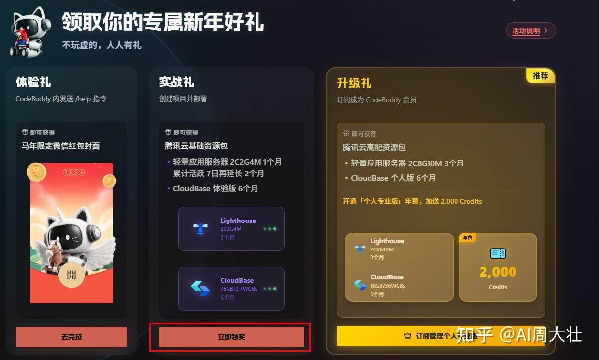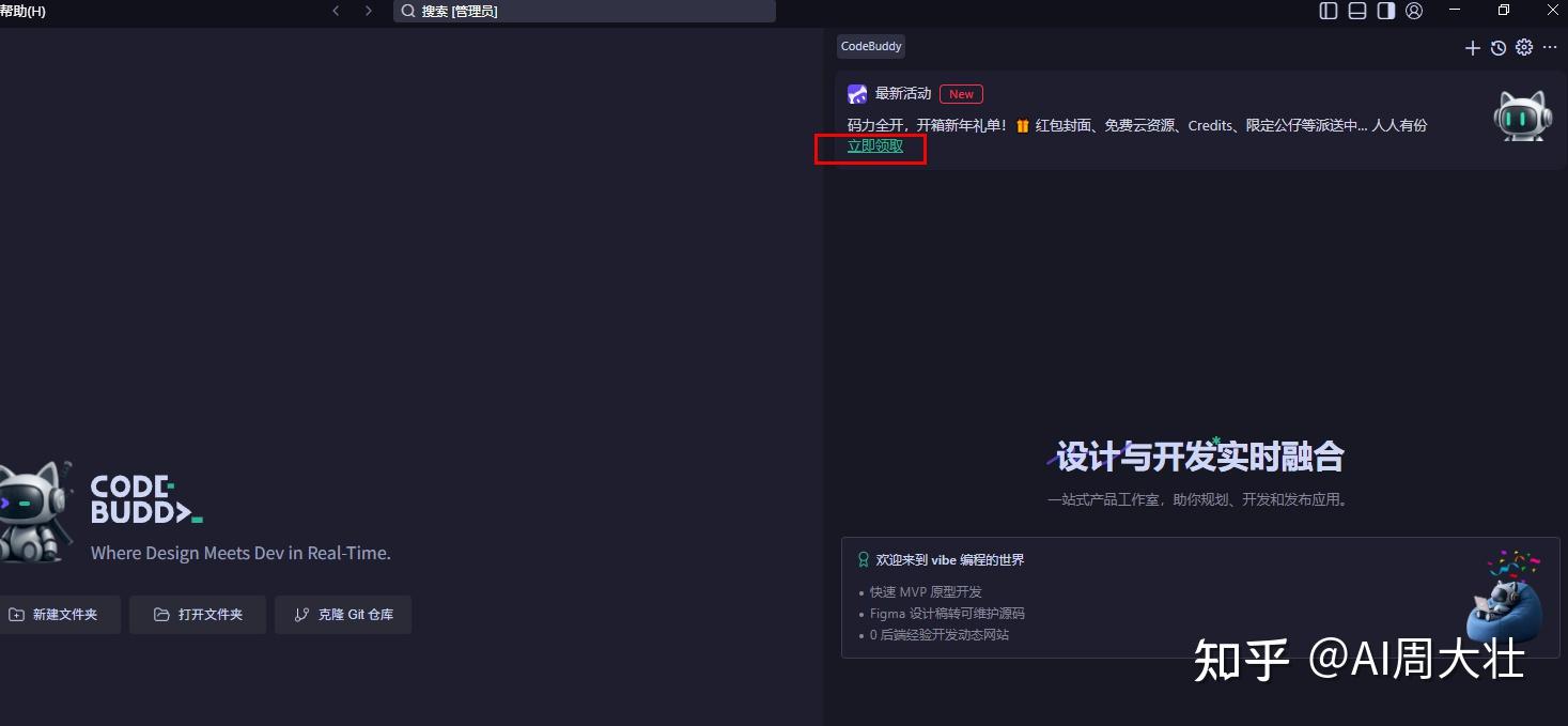 登录成功后,回到 CodeBuddy,会发现右上角出现活动界面,我们点击“立即领取”。