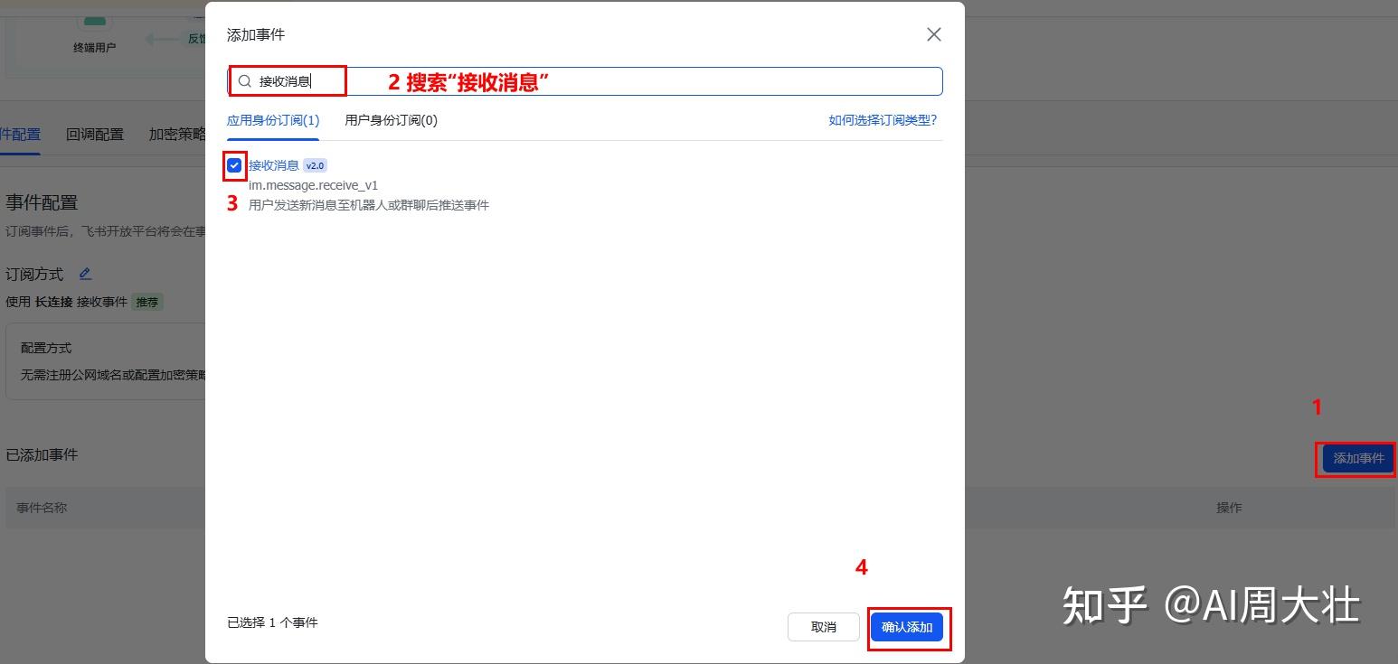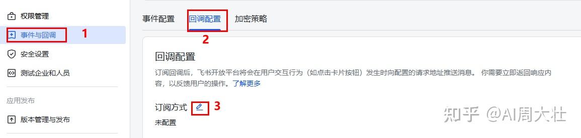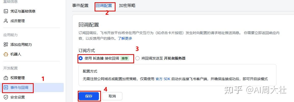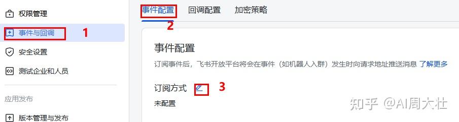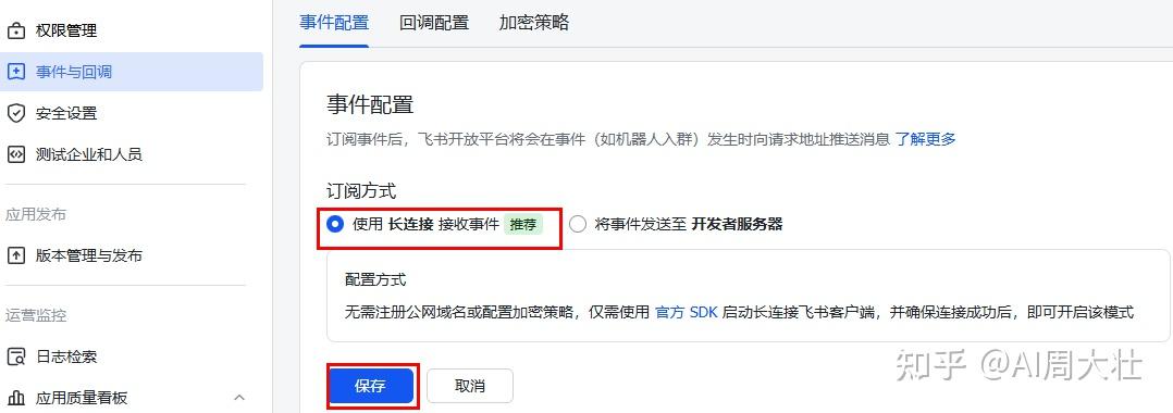进入“事件与回调”页面,先配置事件订阅方式为长连接。