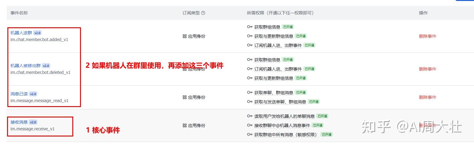 如果要把机器人在群里面使用,还需要添加“消息已读”、“机器人进群”、“机器人被移出群”事件。