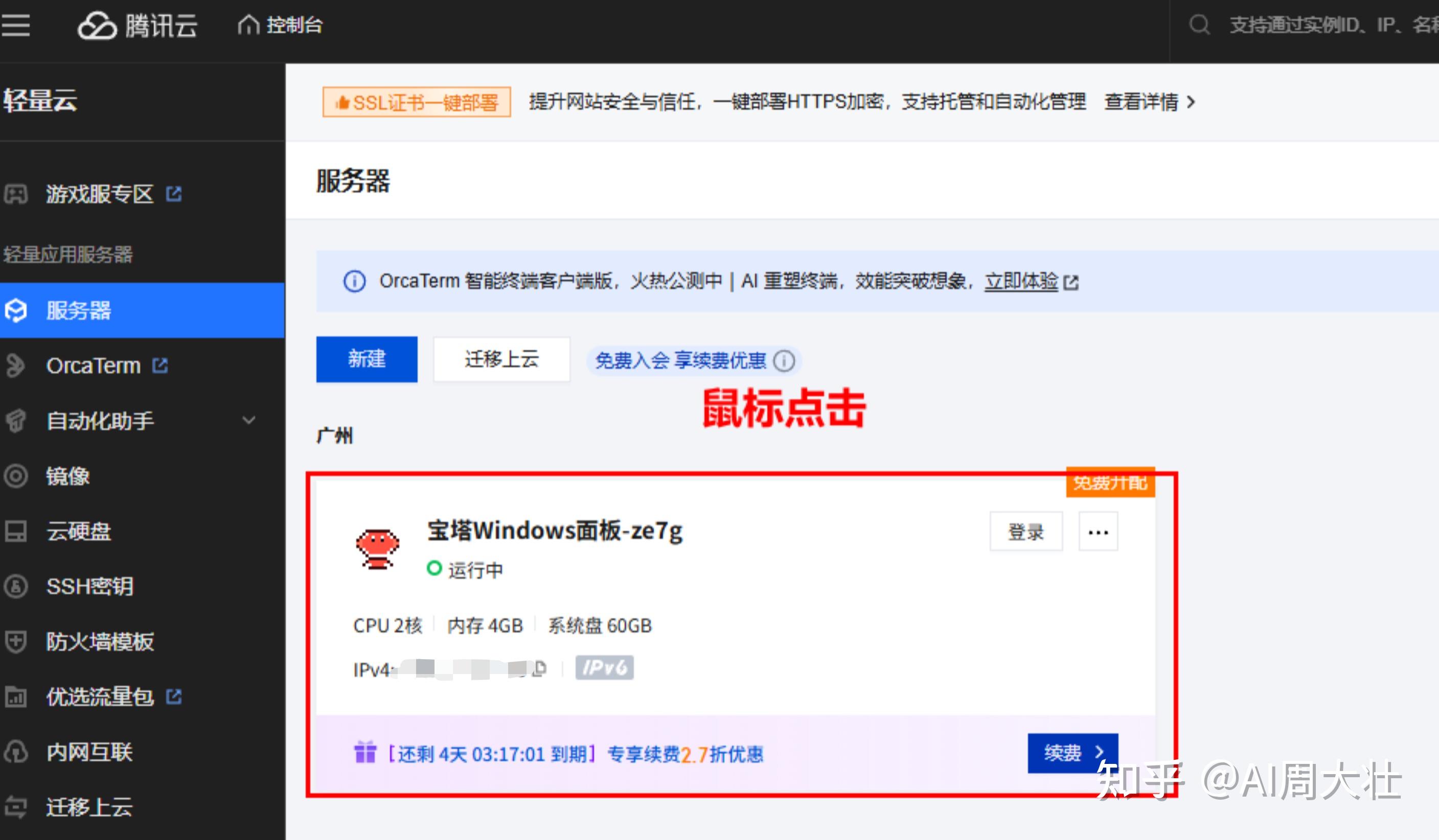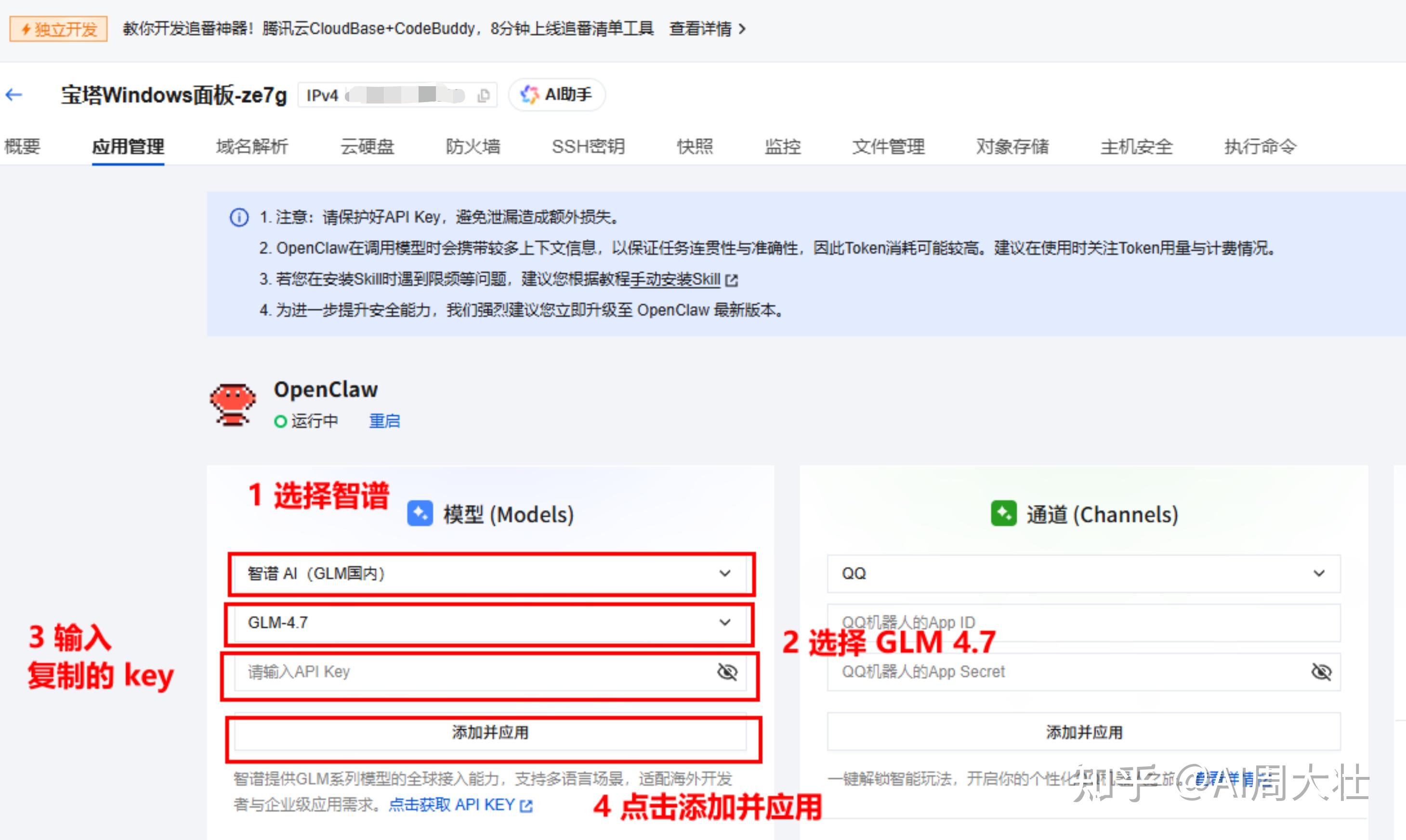 拿到大模型的 API Key 后,回到腾讯云的服务器界面: