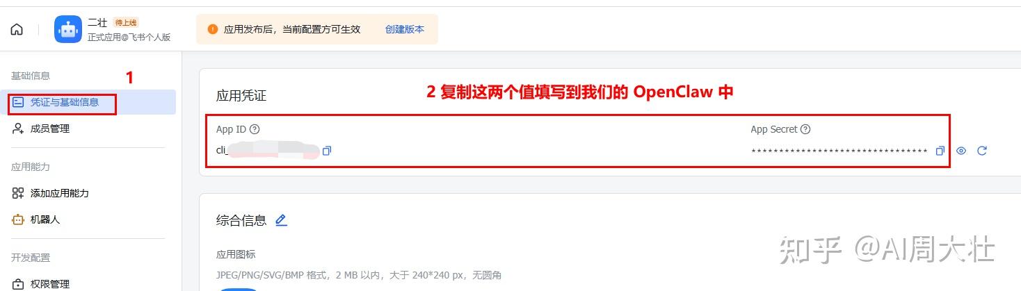 点击左侧“凭据与基础信息”,将 App ID 和 App Secret 的值复制到 OpenClaw 中。