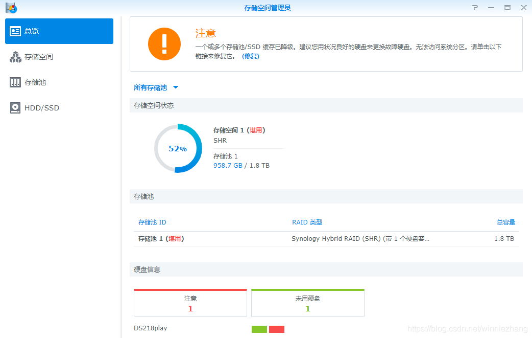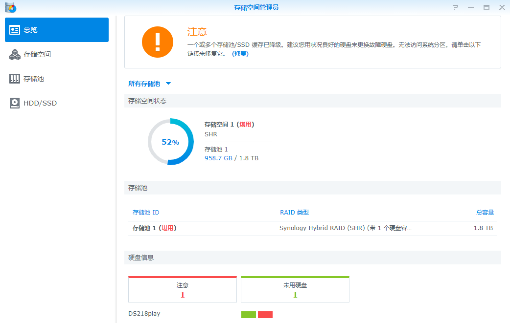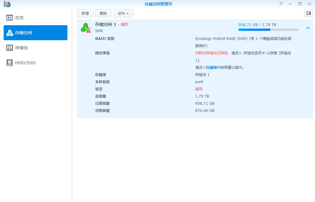转到“存储空间管理员” >“存储池”,然后找到“降级”状态的存储池。