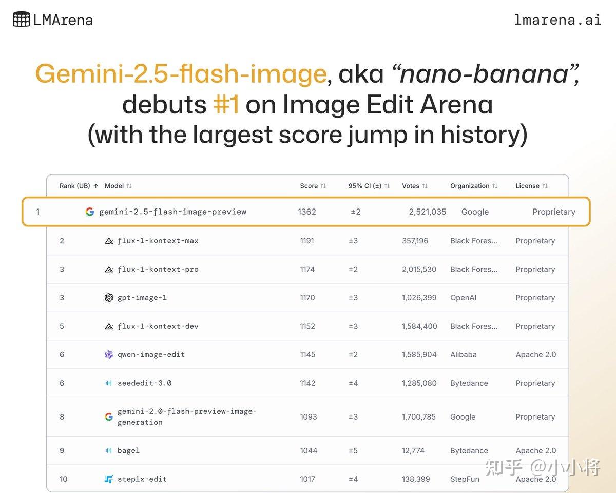 Gemini 2.5 Flash Image经过超过250万的投票,在LMArena的图像编辑排行榜上超过Flux-Kontext和GPT-Image-1,位居第一: