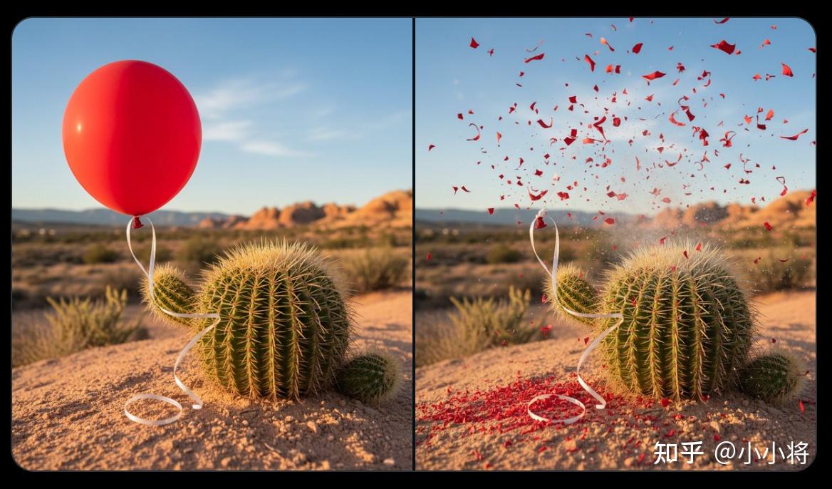 传统图像生成模型虽擅长创作美学图像,却缺乏对现实世界的深度语义理解。Gemini 2.5 Flash Image 可以依托 Gemini 的世界知识体系来进行图像创作。比如Gemini 2.5 Flash Image 可以推理出图像中某一时刻之前或之后可能发生的情景:在生成了气球飘向仙人掌的第一张画面后,可以让它去想象接下来可能发生的场景(气球爆炸):